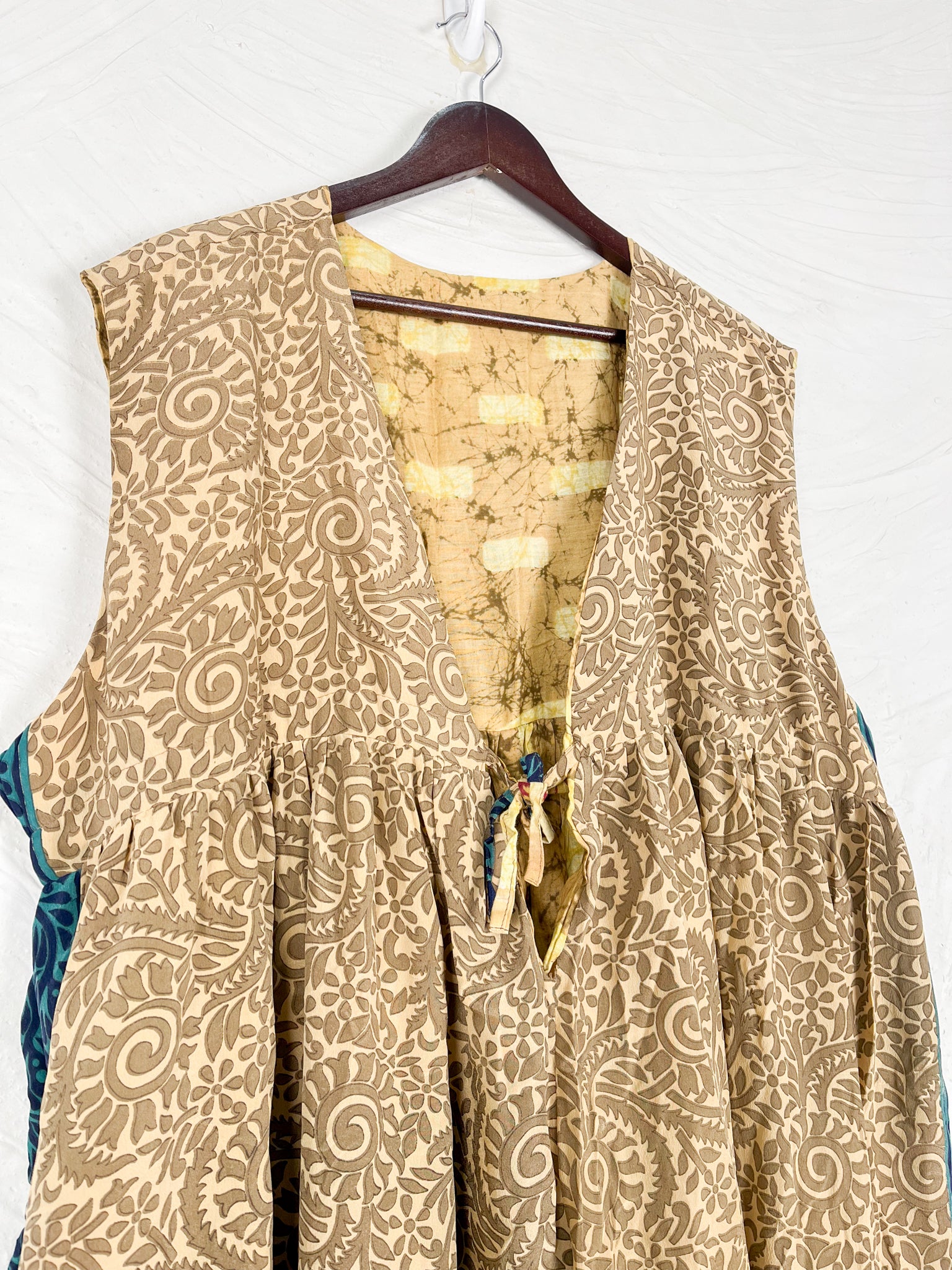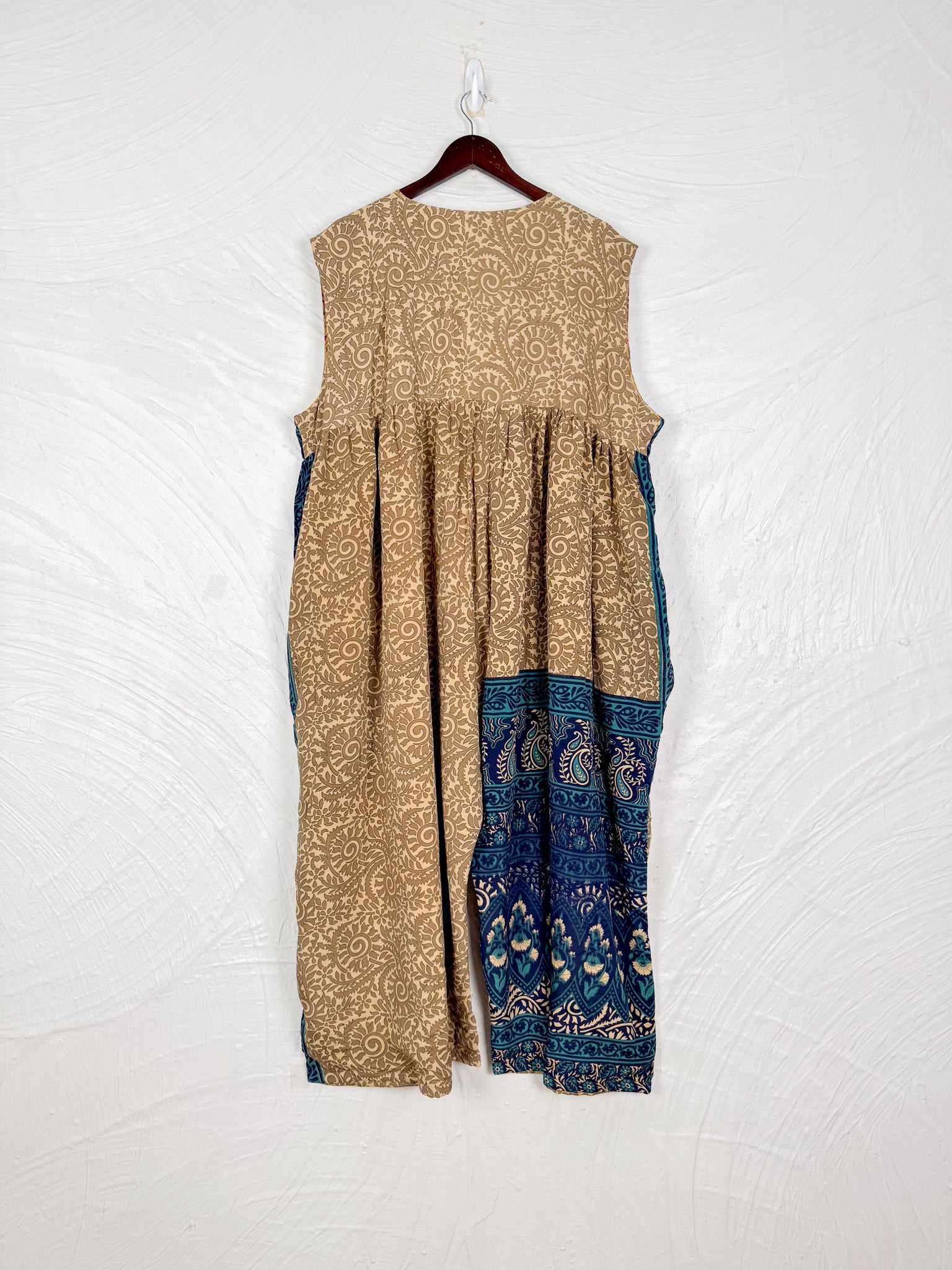 Step into a world of effortless style with this reversible dream of a jumpsuit! Imagine slipping into a single garment that offers two distinct personalities. One side whispers tales of vintage Indian sarees, where vibrant colors, intricate patterns, and the soft touch of recycled cotton create a truly unique, bohemian vibe. Flip it inside out, and you're embraced by the silken whisper of flowy silk, draping beautifully for an elegant and fluid silhouette.