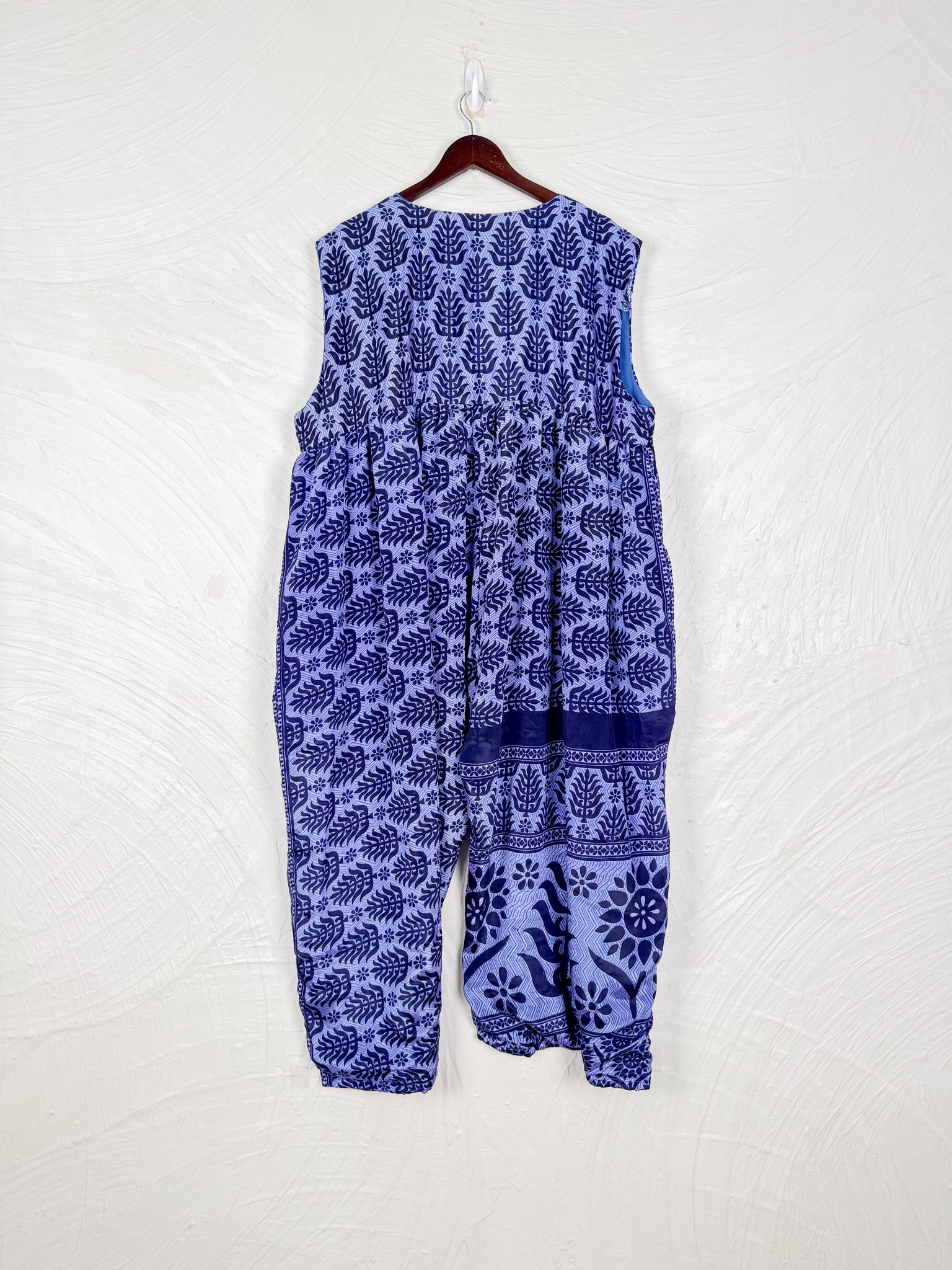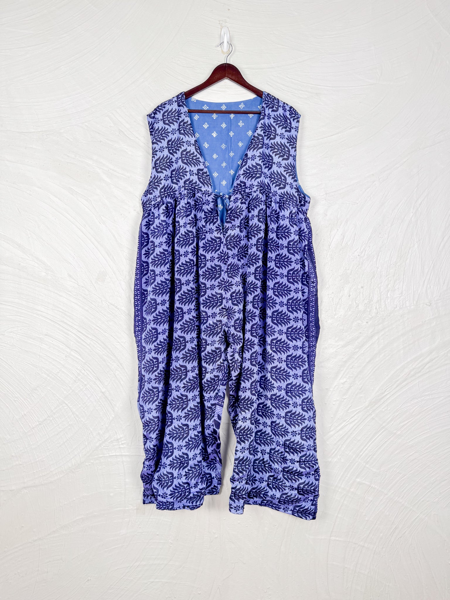 Step into a world of effortless style with this reversible dream of a jumpsuit! Imagine slipping into a single garment that offers two distinct personalities. One side whispers tales of vintage Indian sarees, where vibrant colors, intricate patterns, and the soft touch of recycled cotton create a truly unique, bohemian vibe. Flip it inside out, and you're embraced by the silken whisper of flowy silk, draping beautifully for an elegant and fluid silhouette.