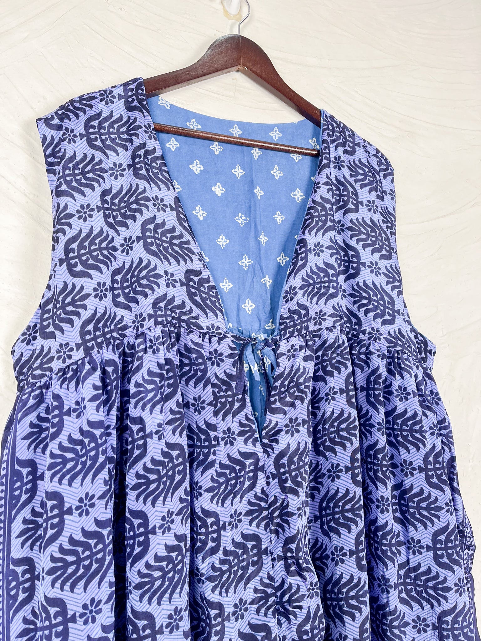 V-Neck with Ties: It features a V-neck opening at the front with fabric ties for closure. The ties appear to be the same pink floral fabric as seen on the reverse shoulder.