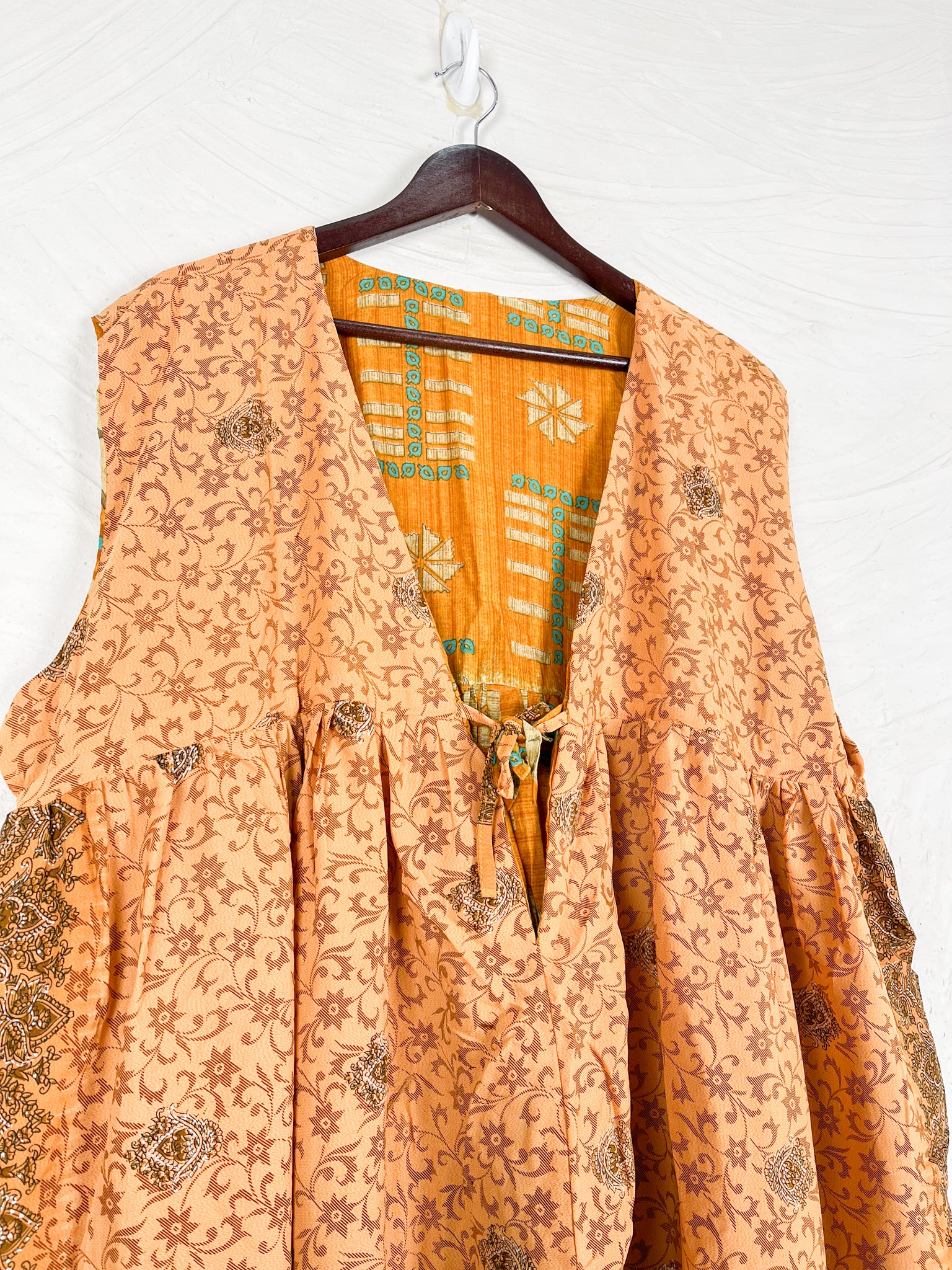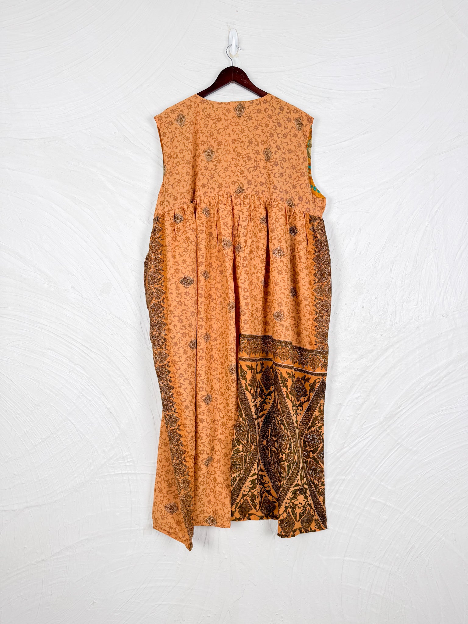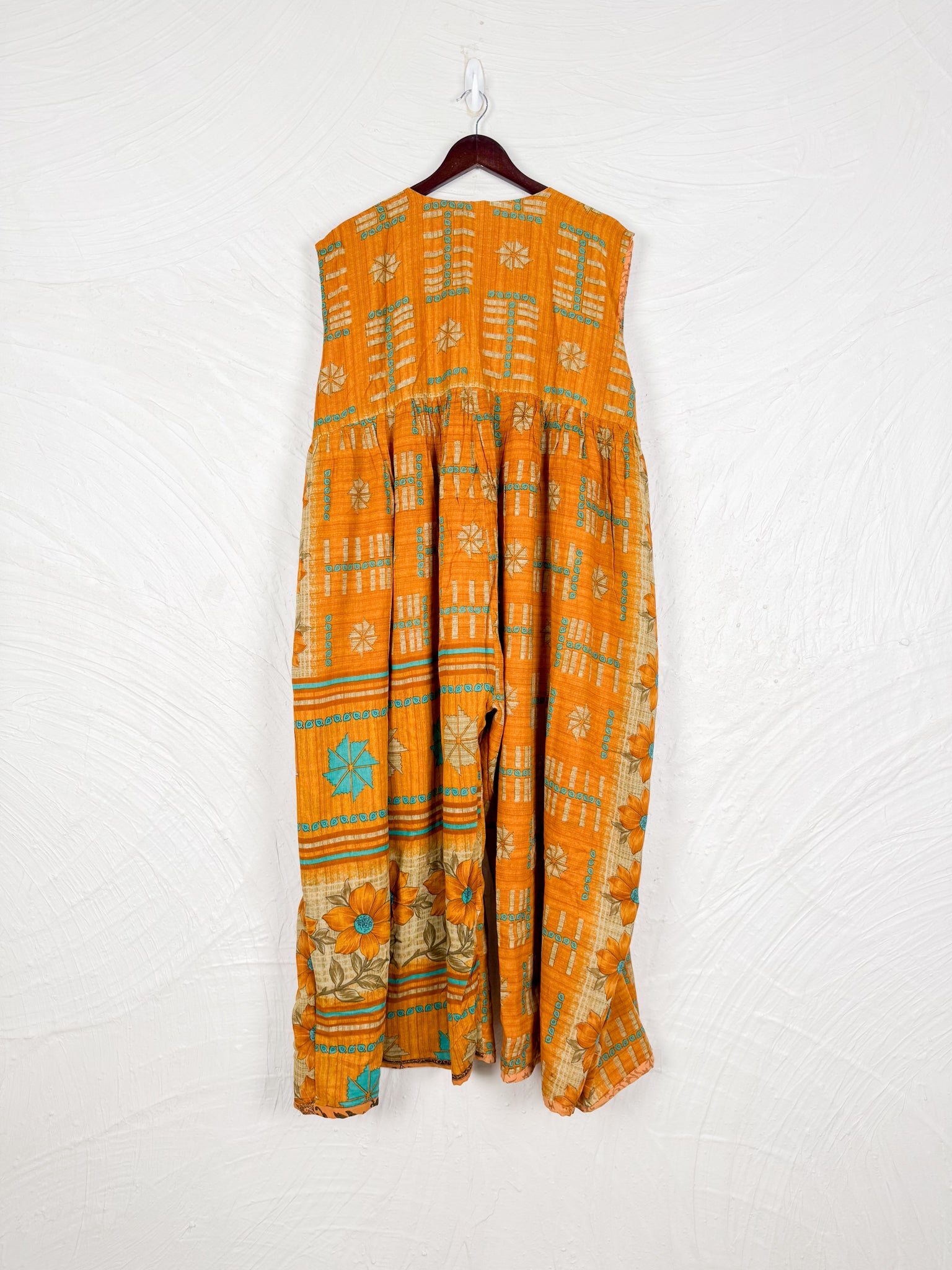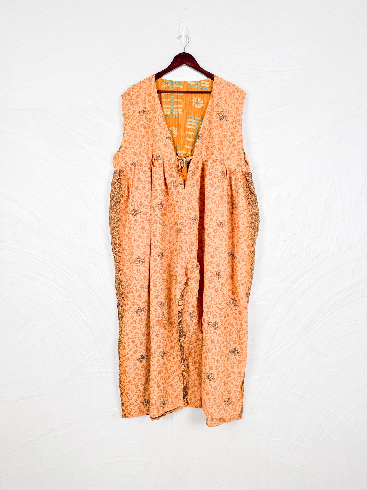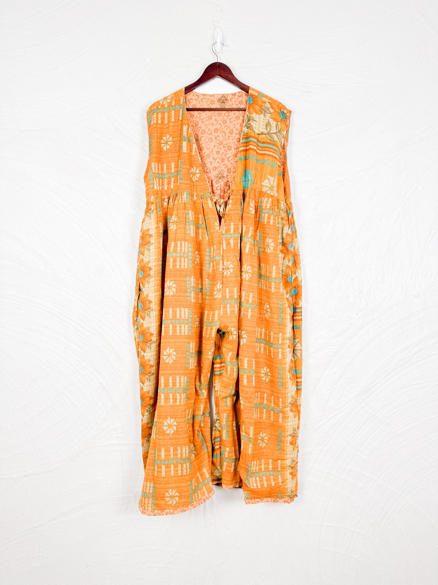 Step into a world of effortless style with this reversible dream of a jumpsuit! Imagine slipping into a single garment that offers two distinct personalities. One side whispers tales of vintage Indian sarees, where vibrant colors, intricate patterns, and the soft touch of recycled cotton create a truly unique, bohemian vibe. Flip it inside out, and you're embraced by the silken whisper of flowy silk, draping beautifully for an elegant and fluid silhouette.