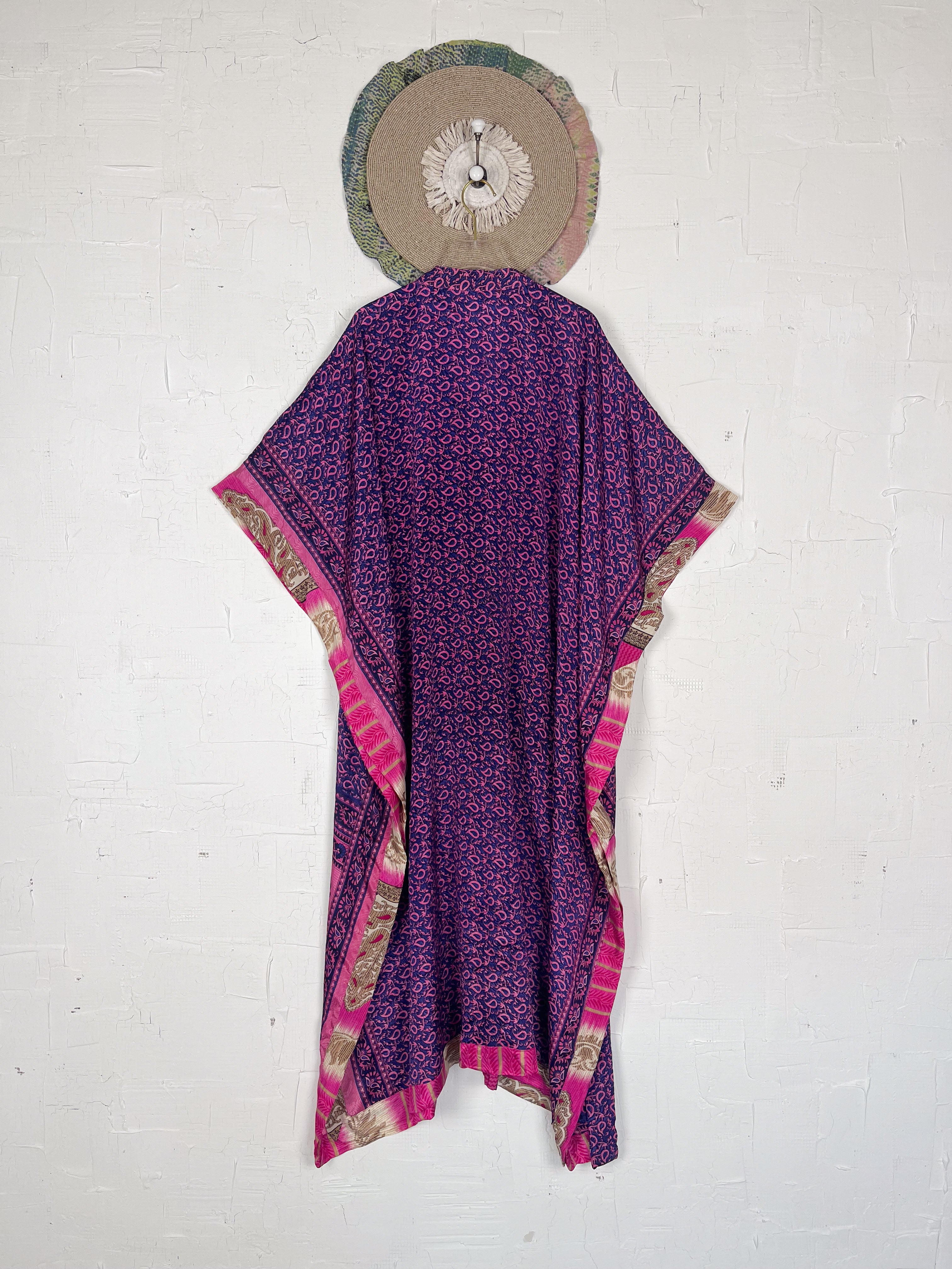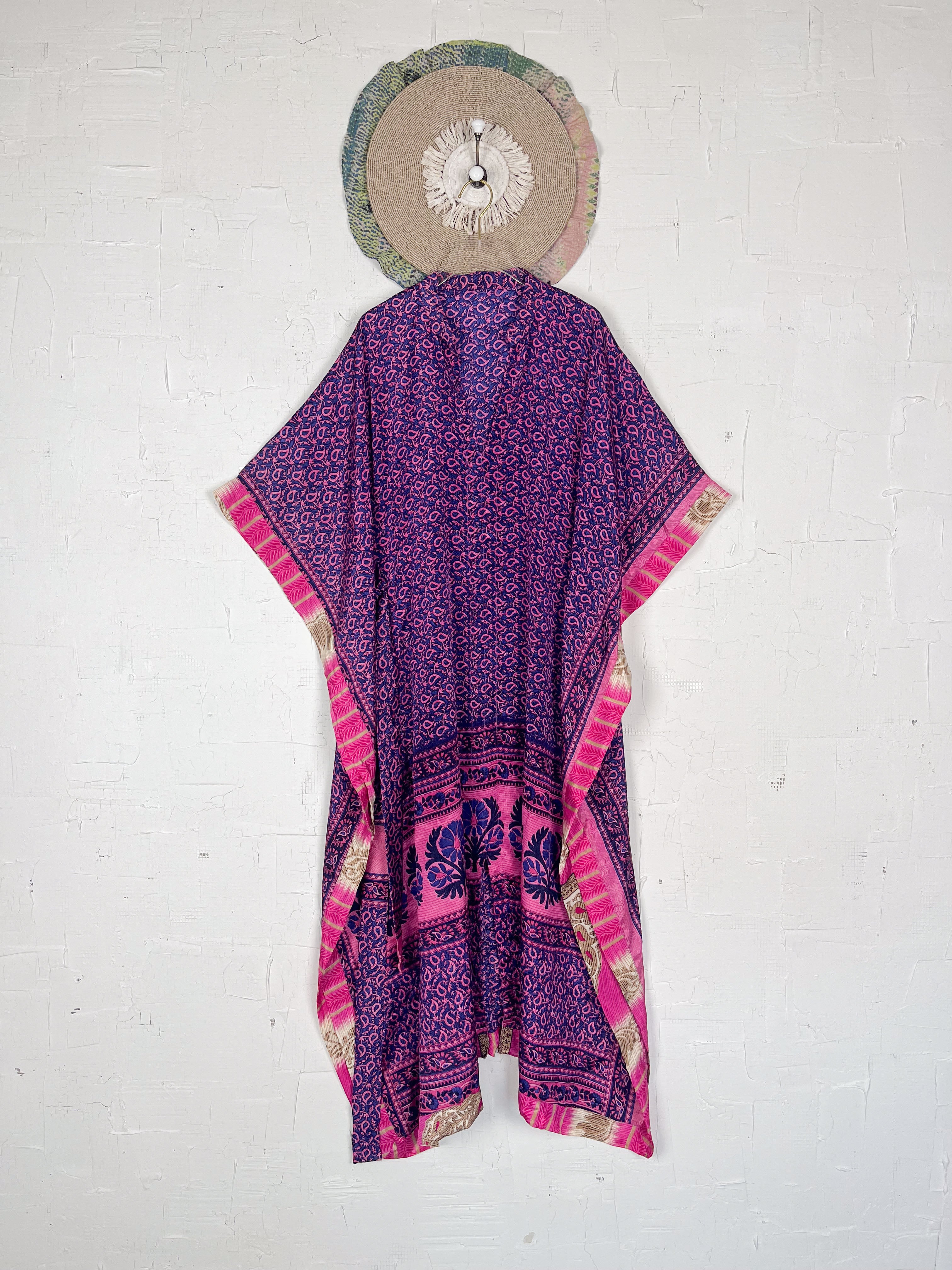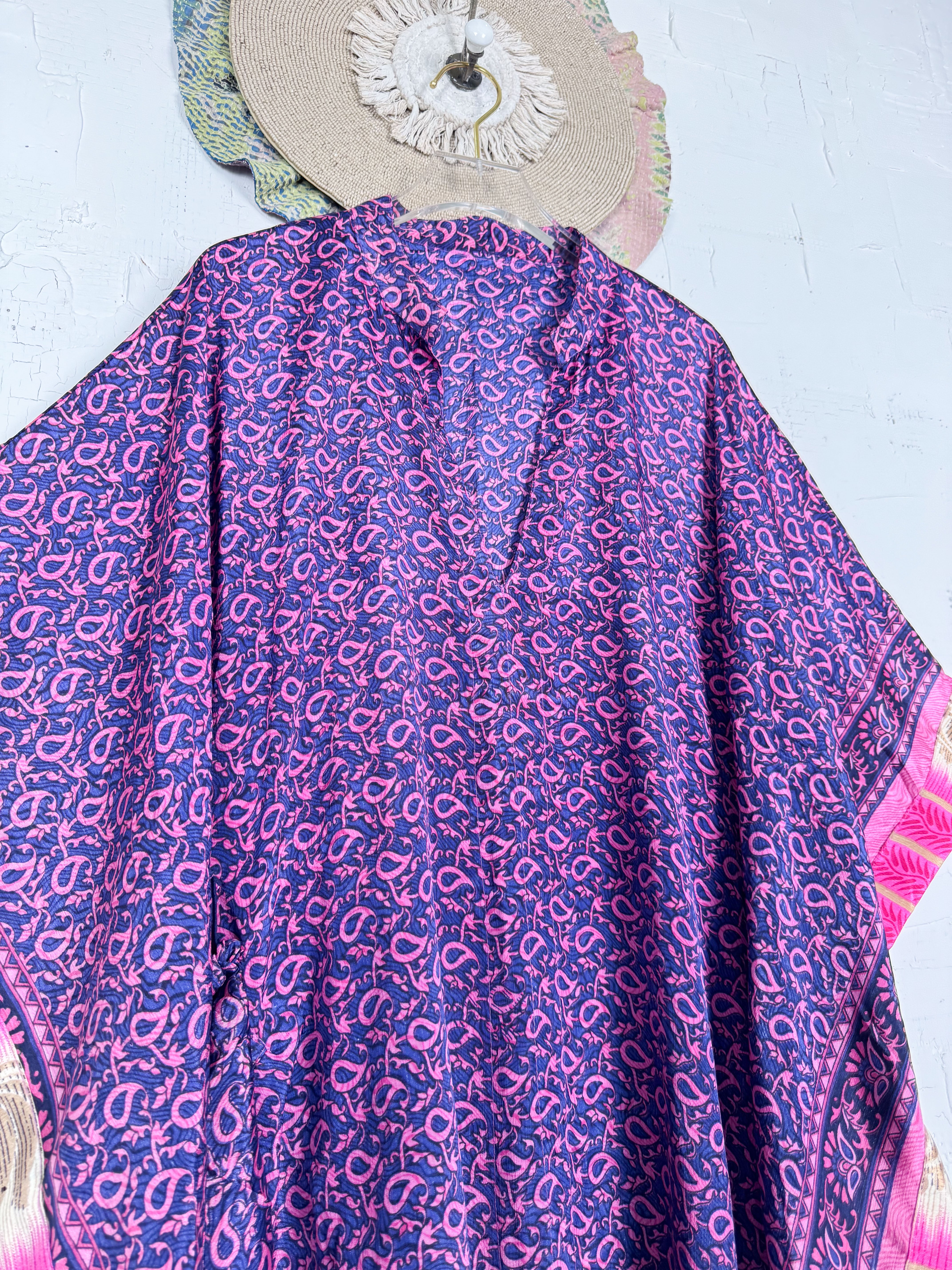 Imagine the lightweight silk, with its soft drape and subtle sheen, gently caressing your skin. The prints and patterns, inspired by vintage Indian sarees, unfold in beautiful shades, a vibrant tapestry of history and artistry. The kaftan's relaxed and airy silhouette gracefully falls to a maxi length, offering both comfort and sophistication. Short, wide sleeves enhance its breezy design, allowing you to move with effortless grace. A tie at the waist cinches, creating a flattering definition for all body shapes and sizes, while the side slits add an amazing flow, making the kaftan dance with your every step. This isn't just clothing; it's an expression of effortless elegance and bohemian-inspired style, designed to enhance your playful feminine spirit and rejuvenate your look.