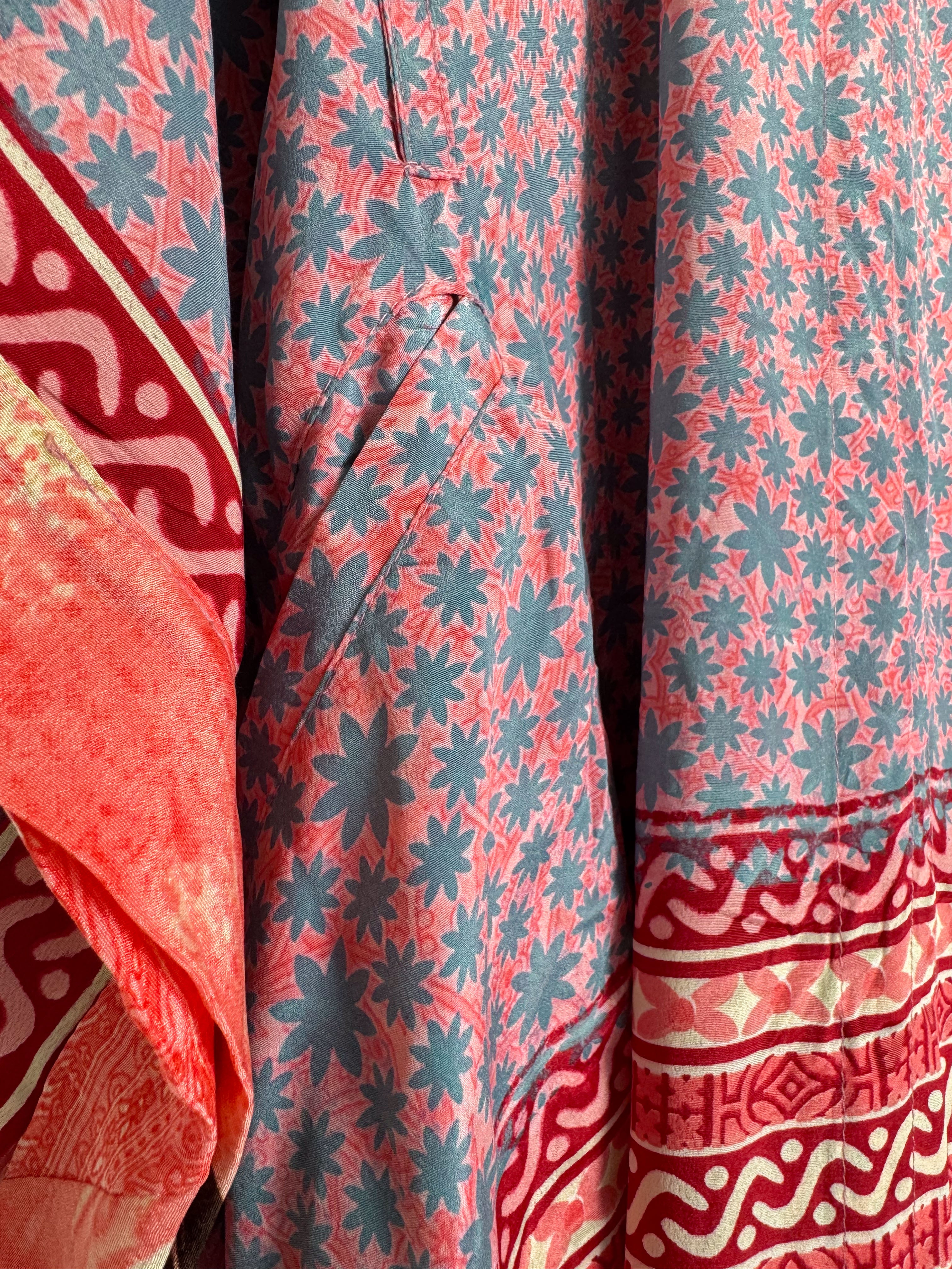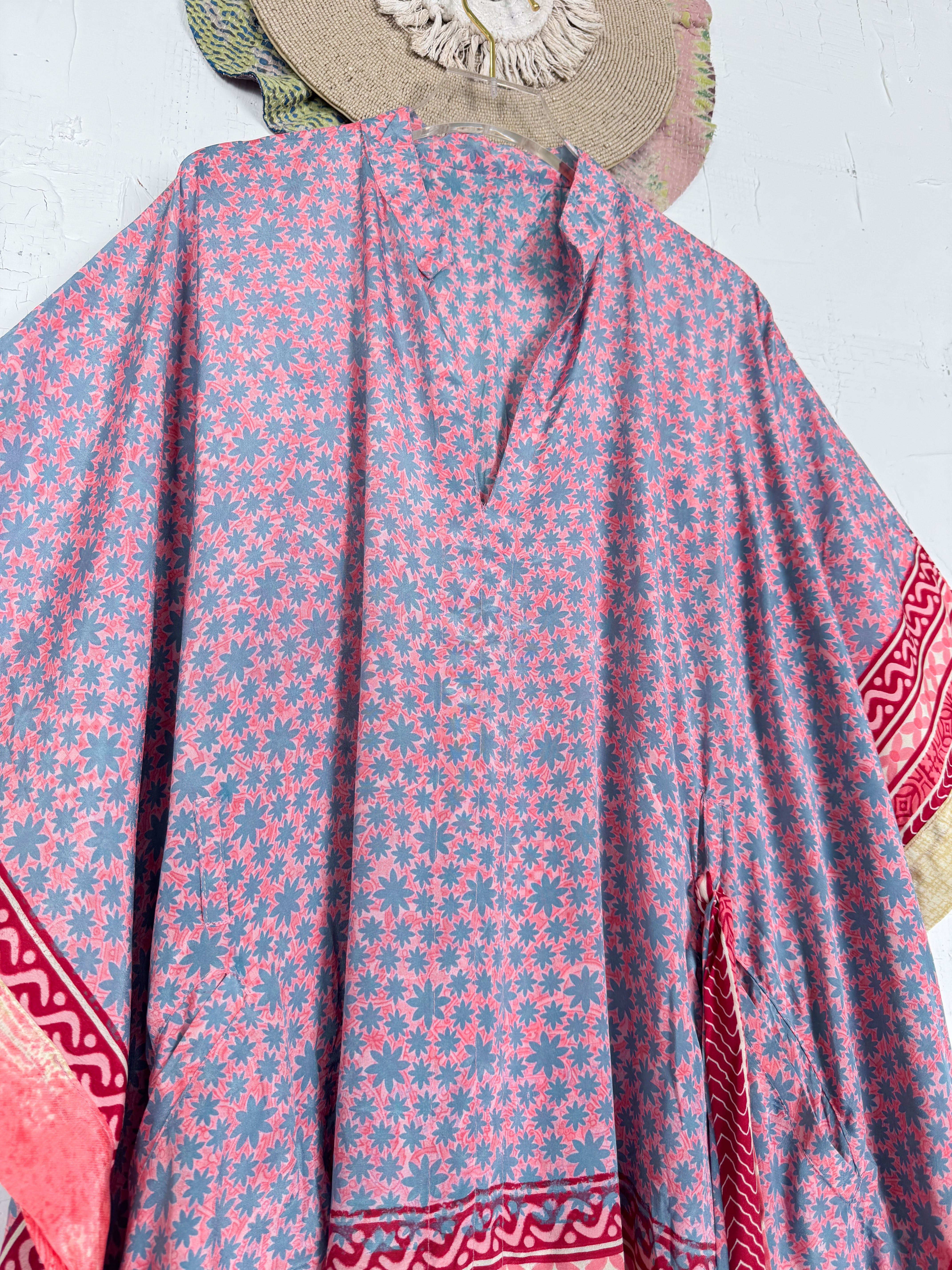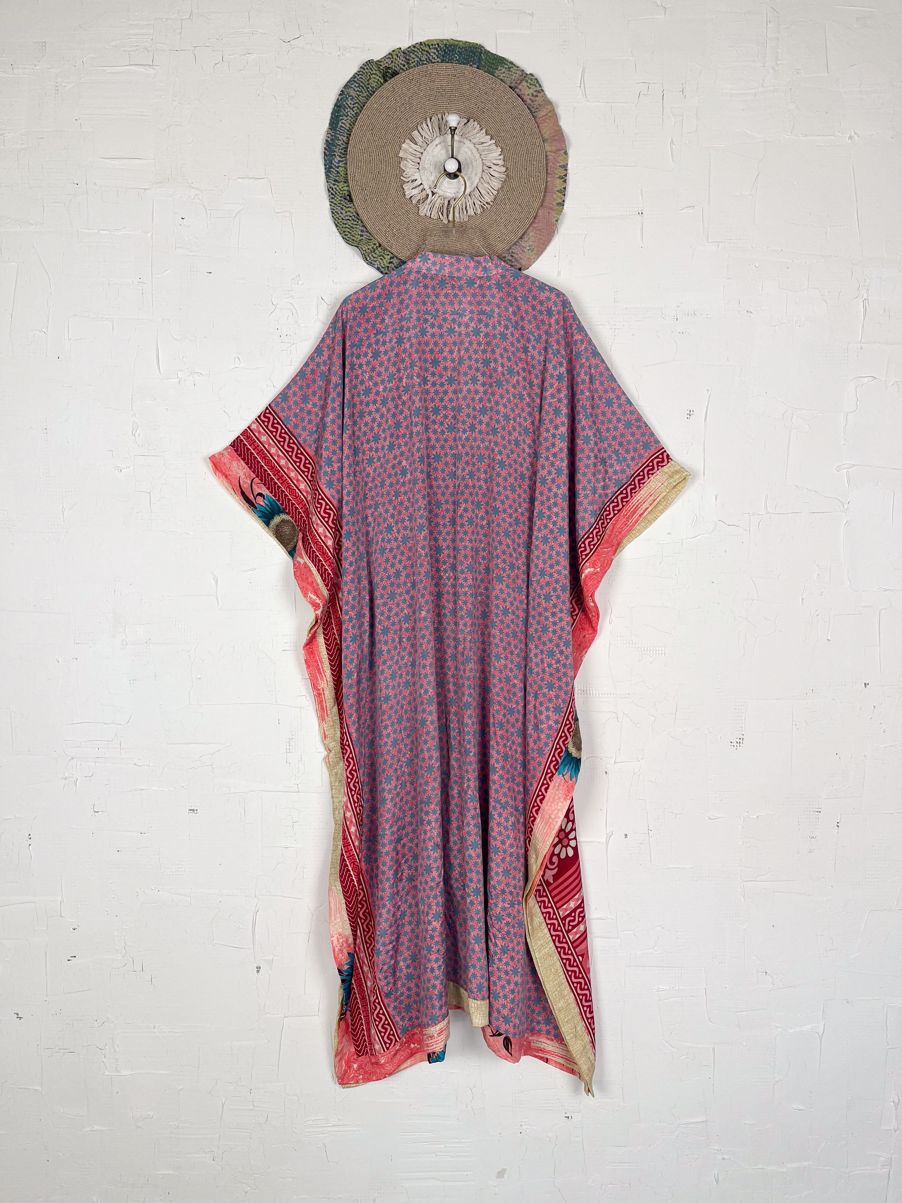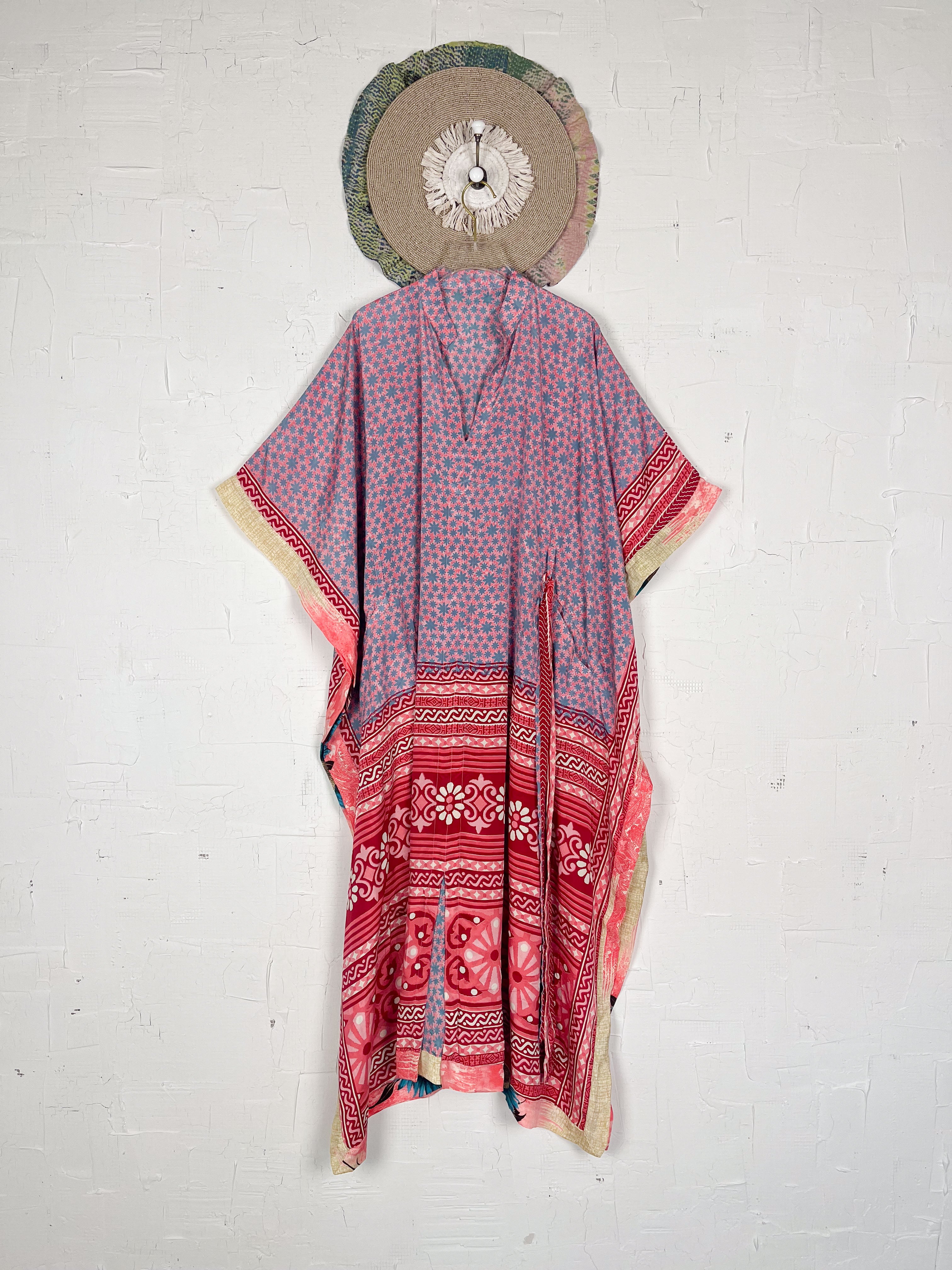 Imagine the lightweight silk, with its soft drape and subtle sheen, gently caressing your skin. The prints and patterns, inspired by vintage Indian sarees, unfold in beautiful shades, a vibrant tapestry of history and artistry. The kaftan's relaxed and airy silhouette gracefully falls to a maxi length, offering both comfort and sophistication. Short, wide sleeves enhance its breezy design, allowing you to move with effortless grace. A tie at the waist cinches, creating a flattering definition for all body shapes and sizes, while the side slits add an amazing flow, making the kaftan dance with your every step. This isn't just clothing; it's an expression of effortless elegance and bohemian-inspired style, designed to enhance your playful feminine spirit and rejuvenate your look.