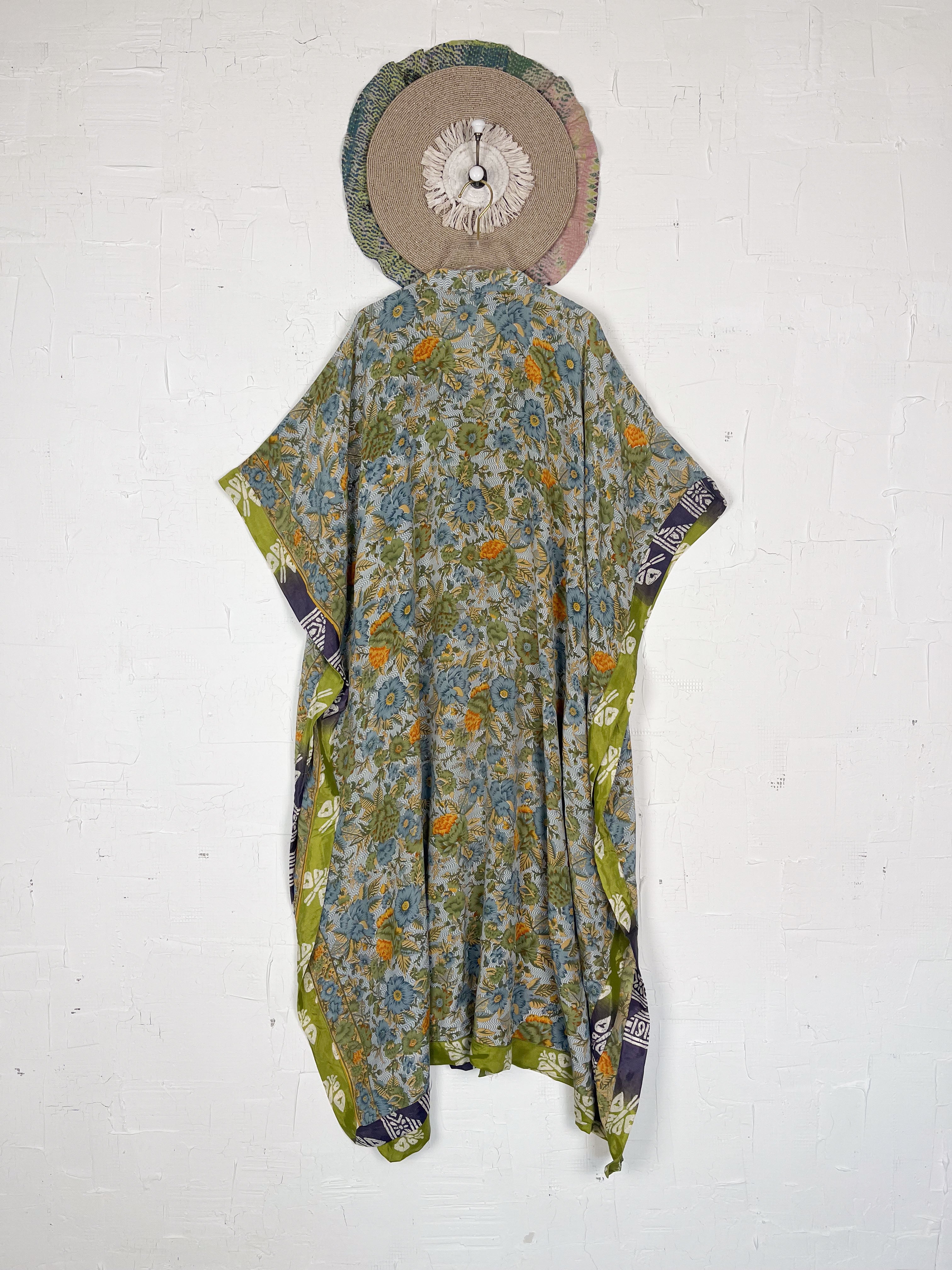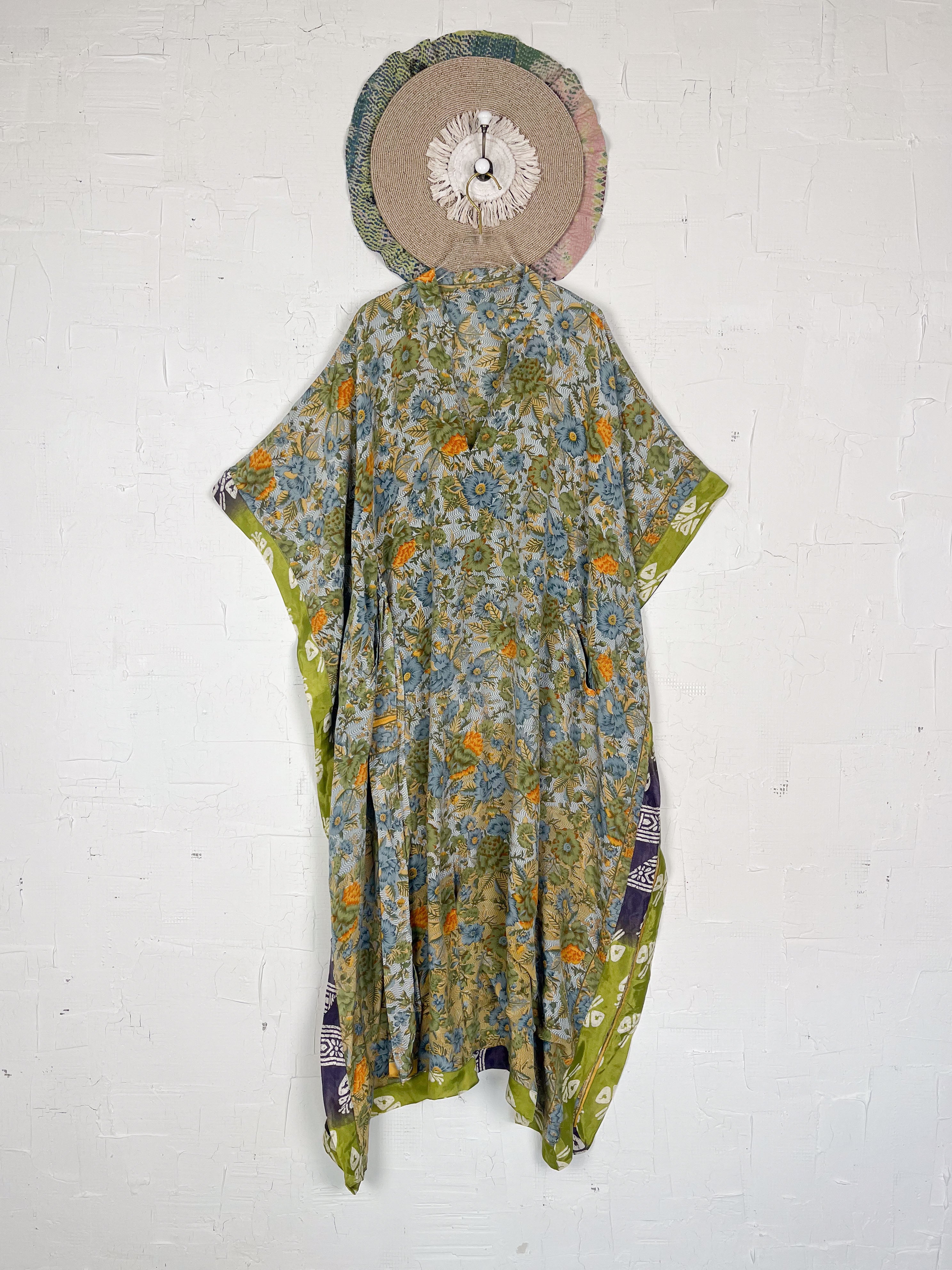 Imagine the lightweight silk, with its soft drape and subtle sheen, gently caressing your skin. The prints and patterns, inspired by vintage Indian sarees, unfold in beautiful shades, a vibrant tapestry of history and artistry. The kaftan's relaxed and airy silhouette gracefully falls to a maxi length, offering both comfort and sophistication. Short, wide sleeves enhance its breezy design, allowing you to move with effortless grace. A tie at the waist cinches, creating a flattering definition for all body shapes and sizes, while the side slits add an amazing flow, making the kaftan dance with your every step. This isn't just clothing; it's an expression of effortless elegance and bohemian-inspired style, designed to enhance your playful feminine spirit and rejuvenate your look.