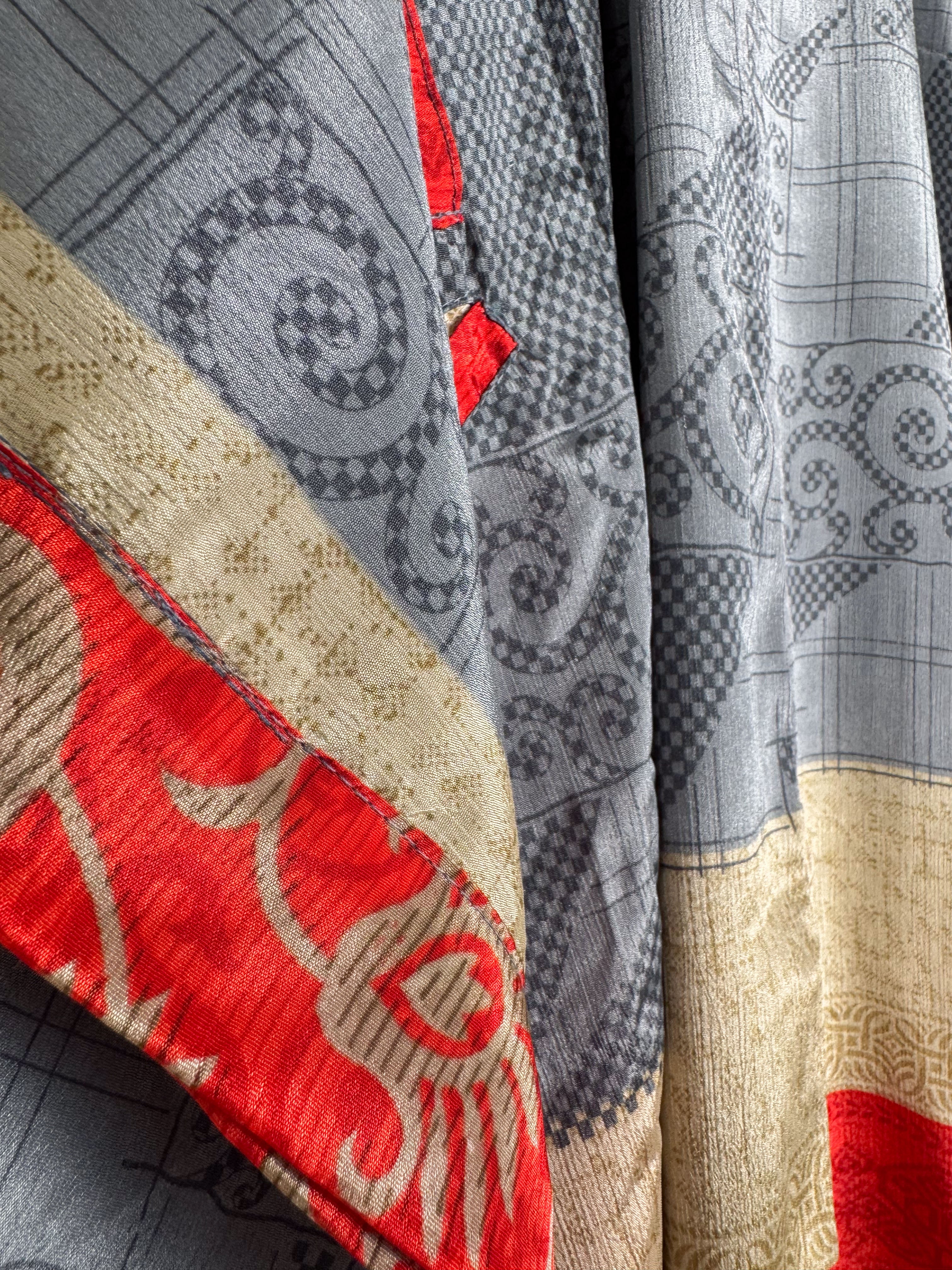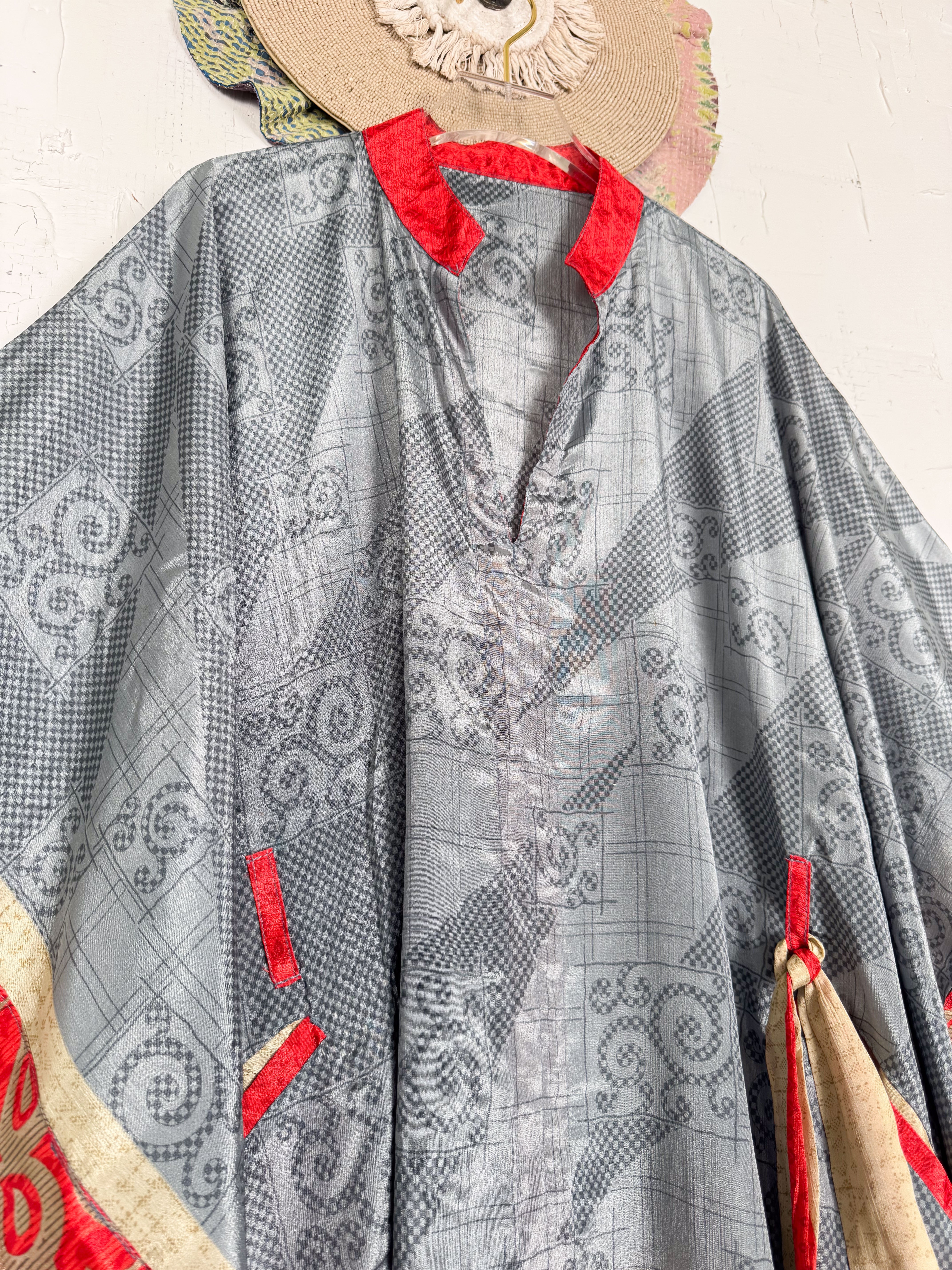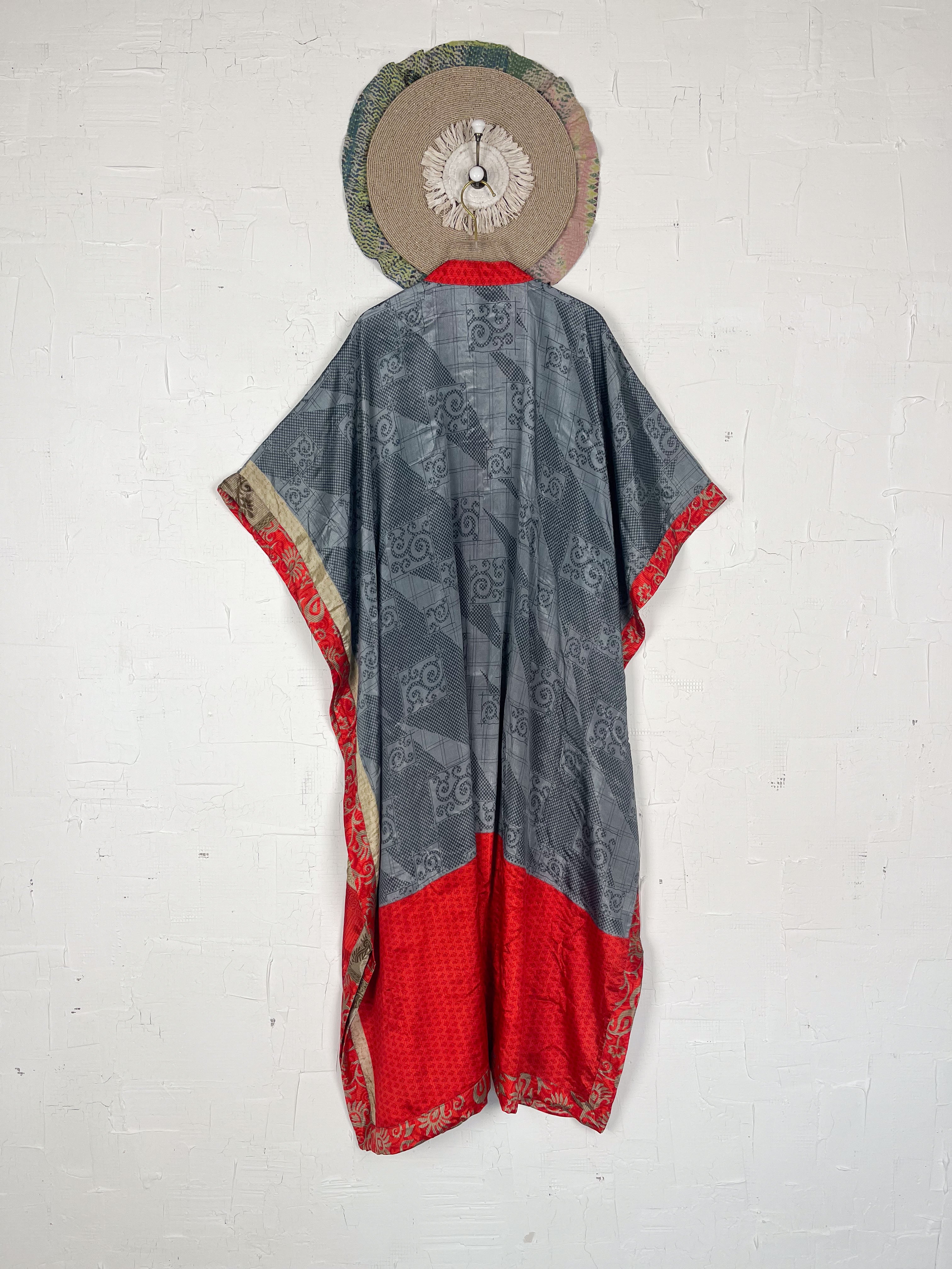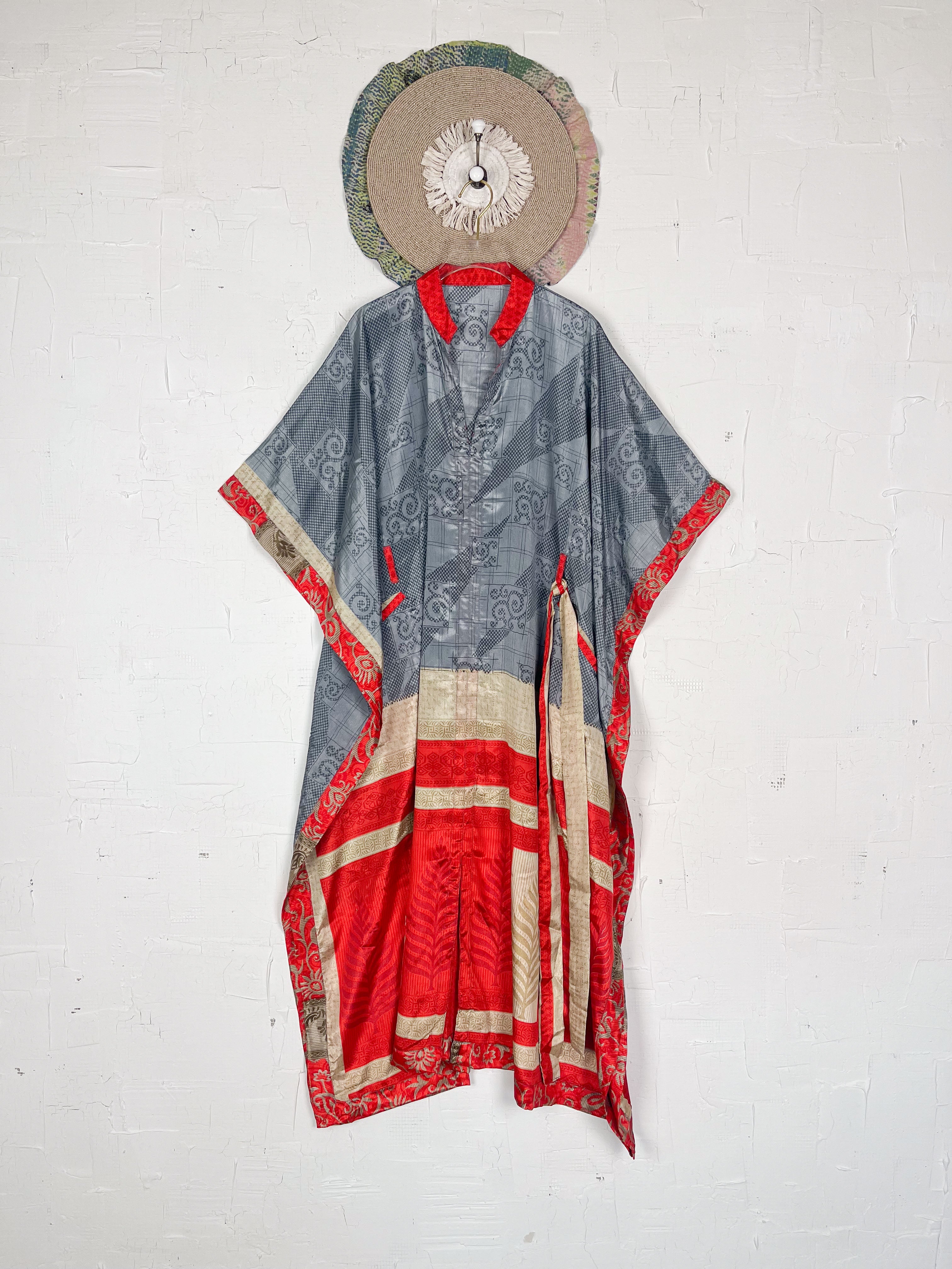 Imagine the lightweight silk, with its soft drape and subtle sheen, gently caressing your skin. The prints and patterns, inspired by vintage Indian sarees, unfold in beautiful shades, a vibrant tapestry of history and artistry. The kaftan's relaxed and airy silhouette gracefully falls to a maxi length, offering both comfort and sophistication. Short, wide sleeves enhance its breezy design, allowing you to move with effortless grace. A tie at the waist cinches, creating a flattering definition for all body shapes and sizes, while the side slits add an amazing flow, making the kaftan dance with your every step. This isn't just clothing; it's an expression of effortless elegance and bohemian-inspired style, designed to enhance your playful feminine spirit and rejuvenate your look.