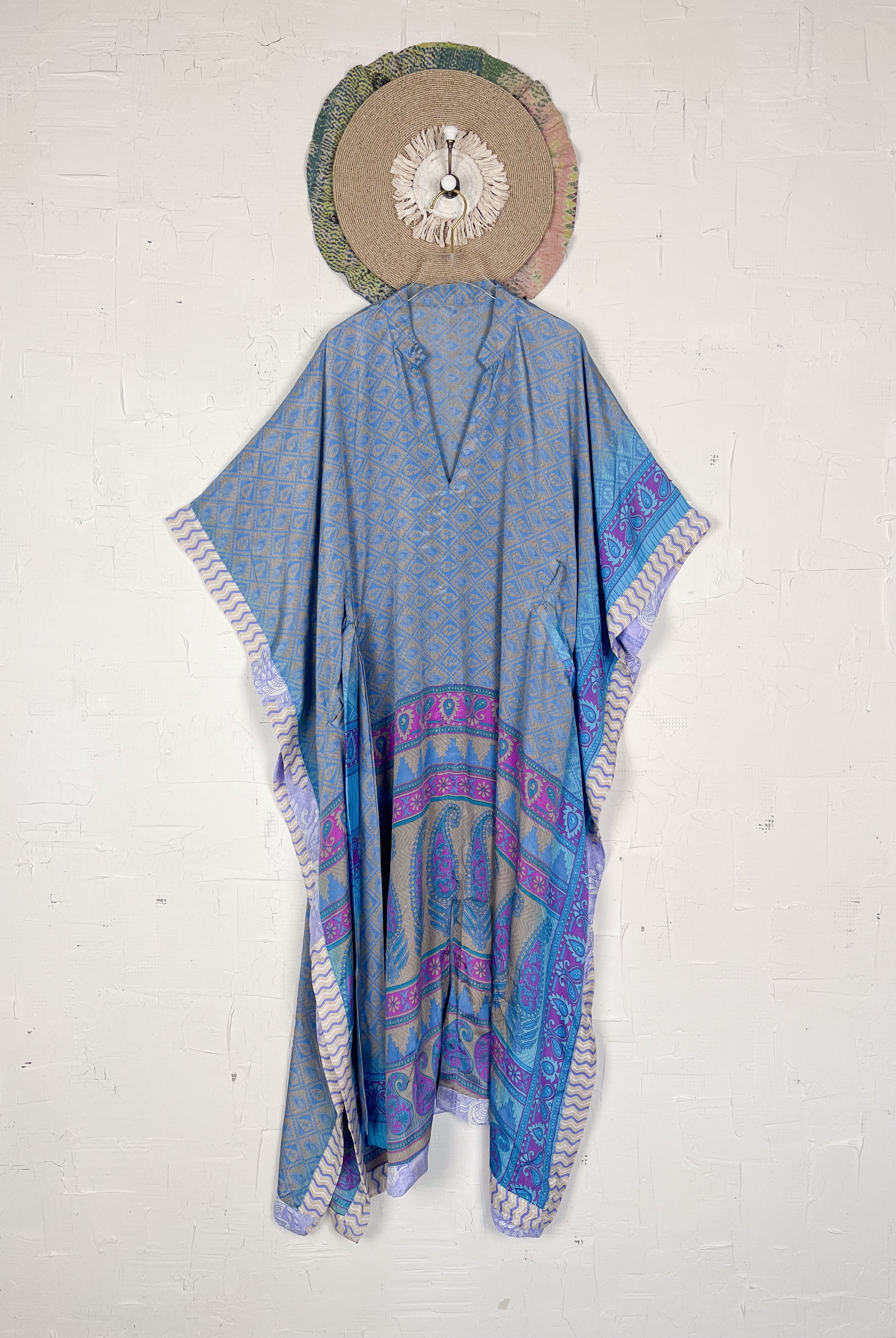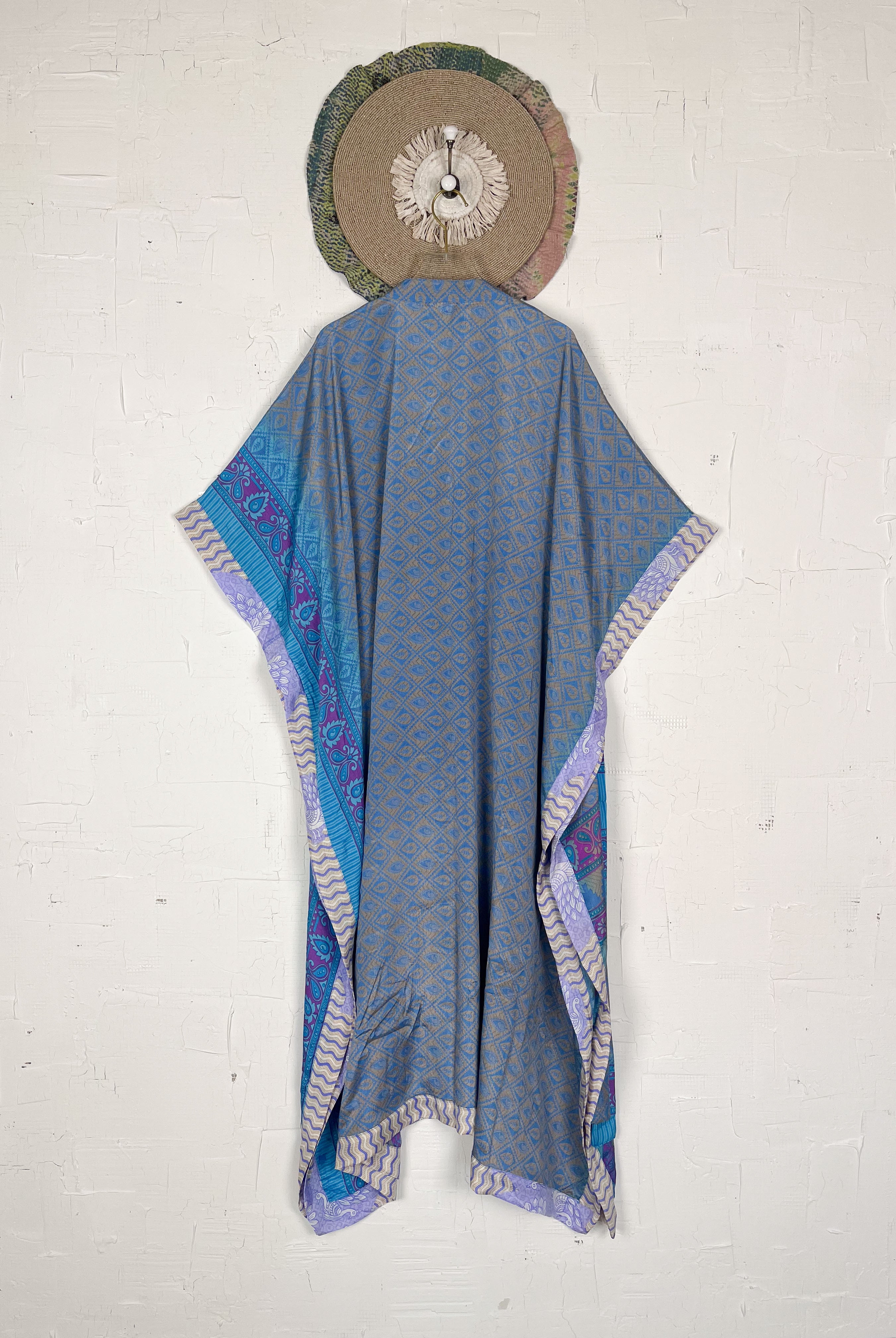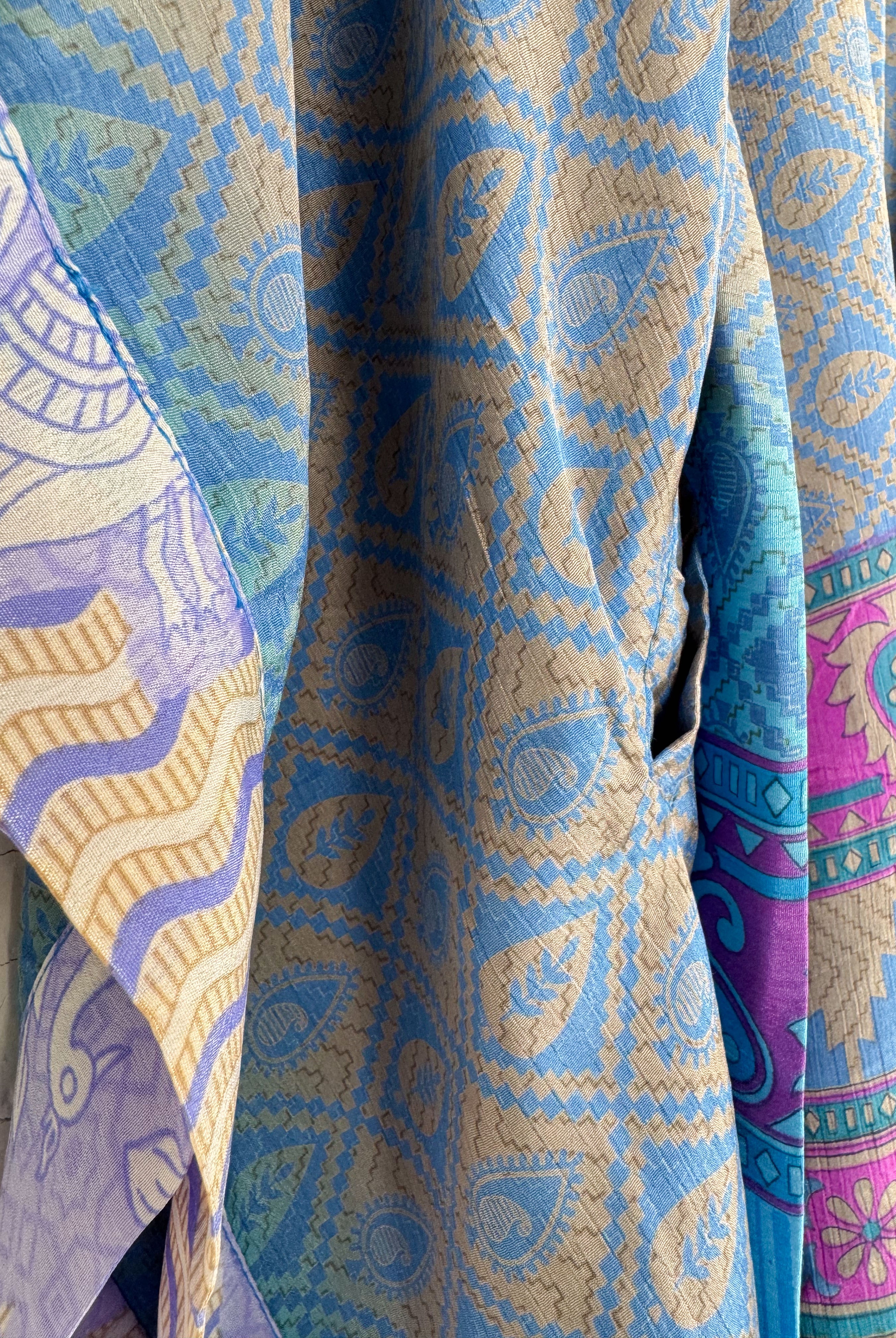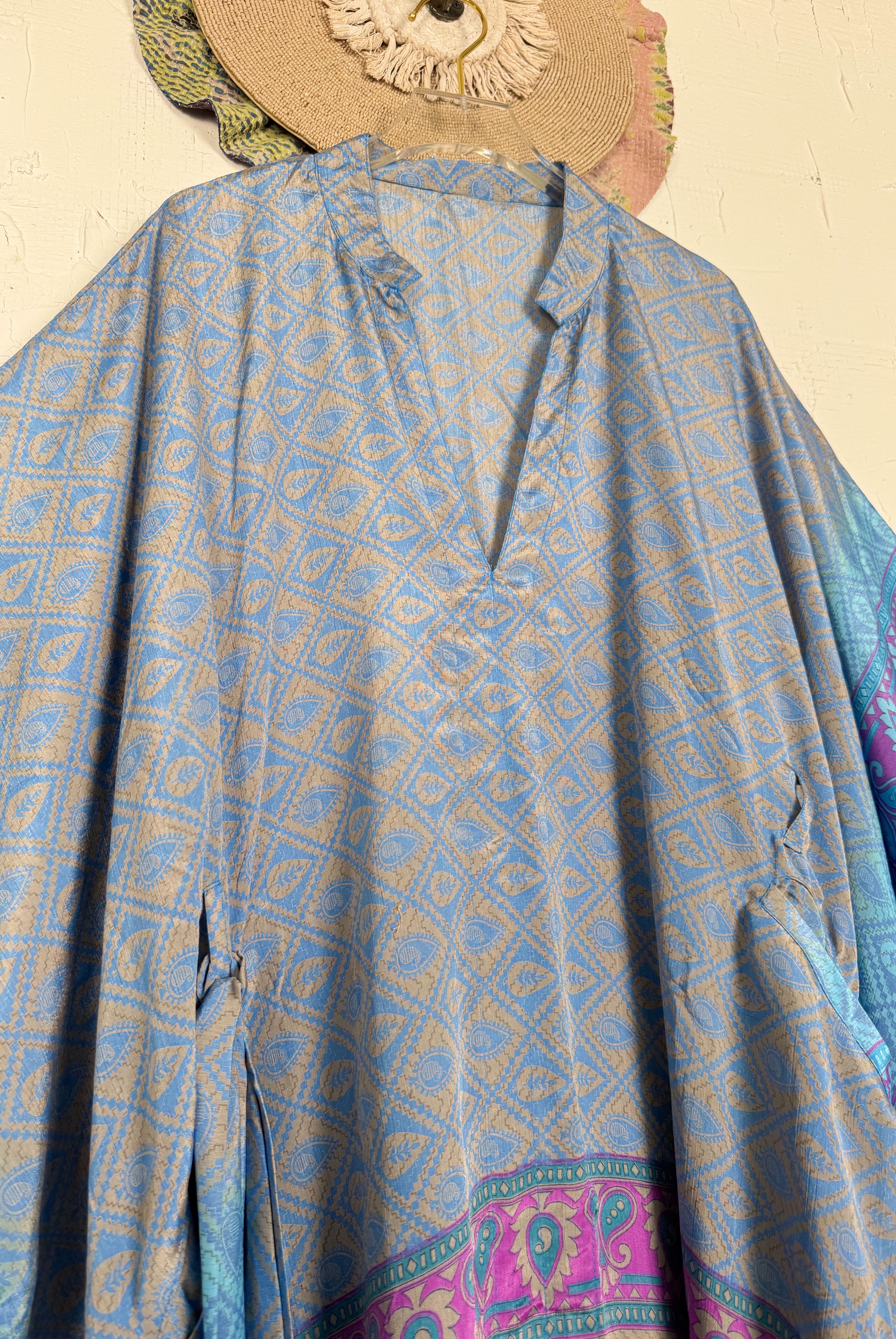 This flowing vintage silk kaftan, adorned with beautiful floral patterns from Indian sarees, offers luxurious comfort and effortless elegance. Its relaxed maxi silhouette, wide sleeves, and waist tie flatter all figures, creating a versatile, bohemian-inspired piece with amazing side slits.