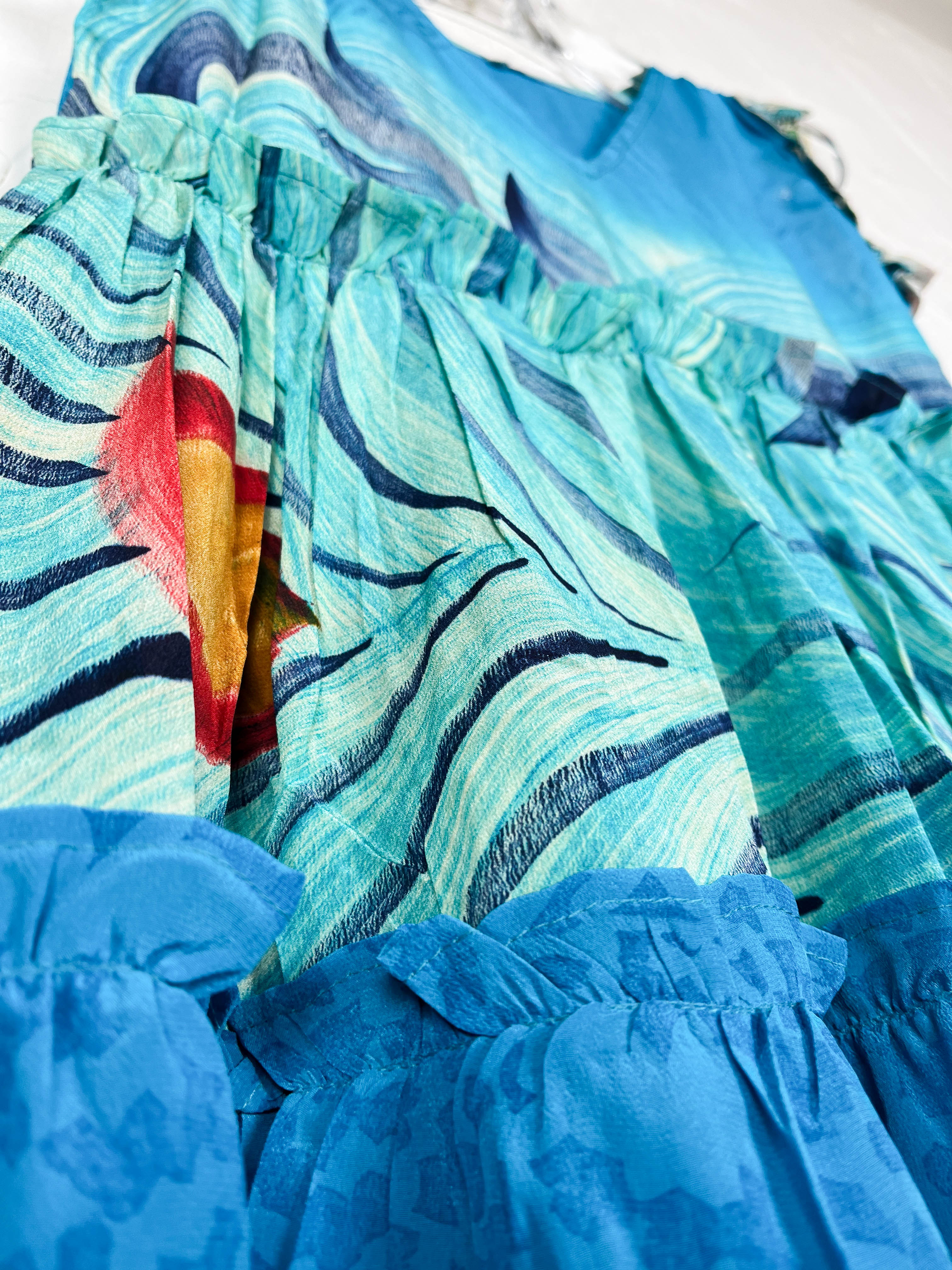 Handcrafted from Vintage Crepe Silk, every stitch and the flowy ruffle tells a story of craftsmanship, emotions and heritage!