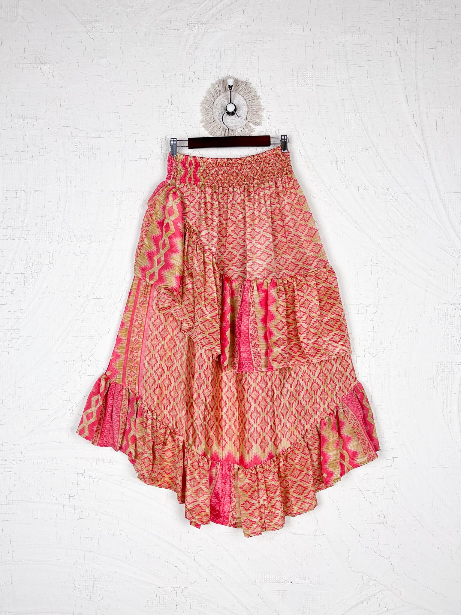 The vibrant Silk Ruffles with Beautiful of colors and prints ensures each peice is a unique work of art. Designed with an adjustable waist, they offer a perfect fit in all inclusive sizes. Embrace the beauty of individuality with these truly special Skirts.