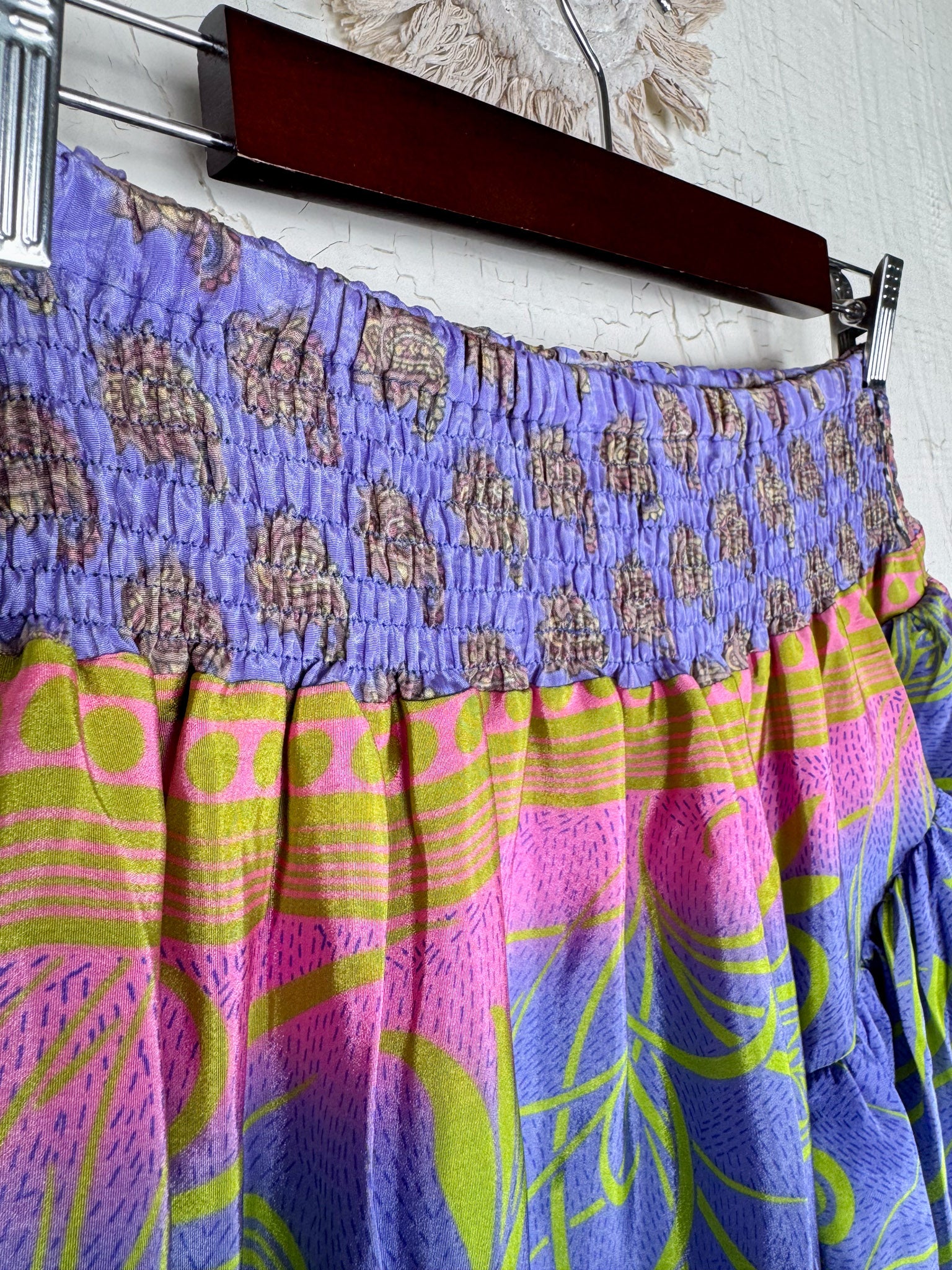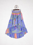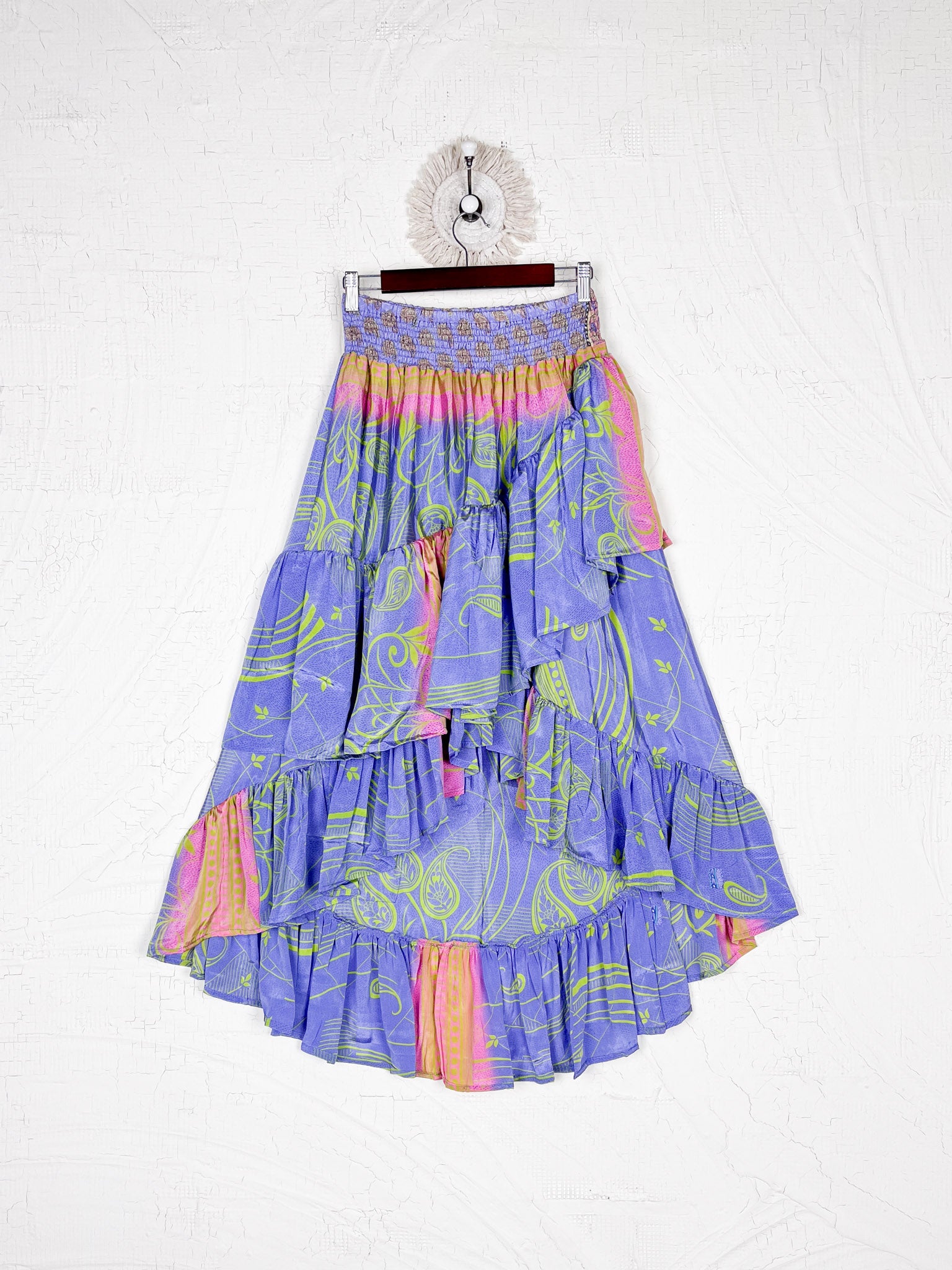 Silk: Silk skirt made from layered, ruffle gather all around in assymetric manner. The silk patchwork done with Vintage Indian Silk Saress.