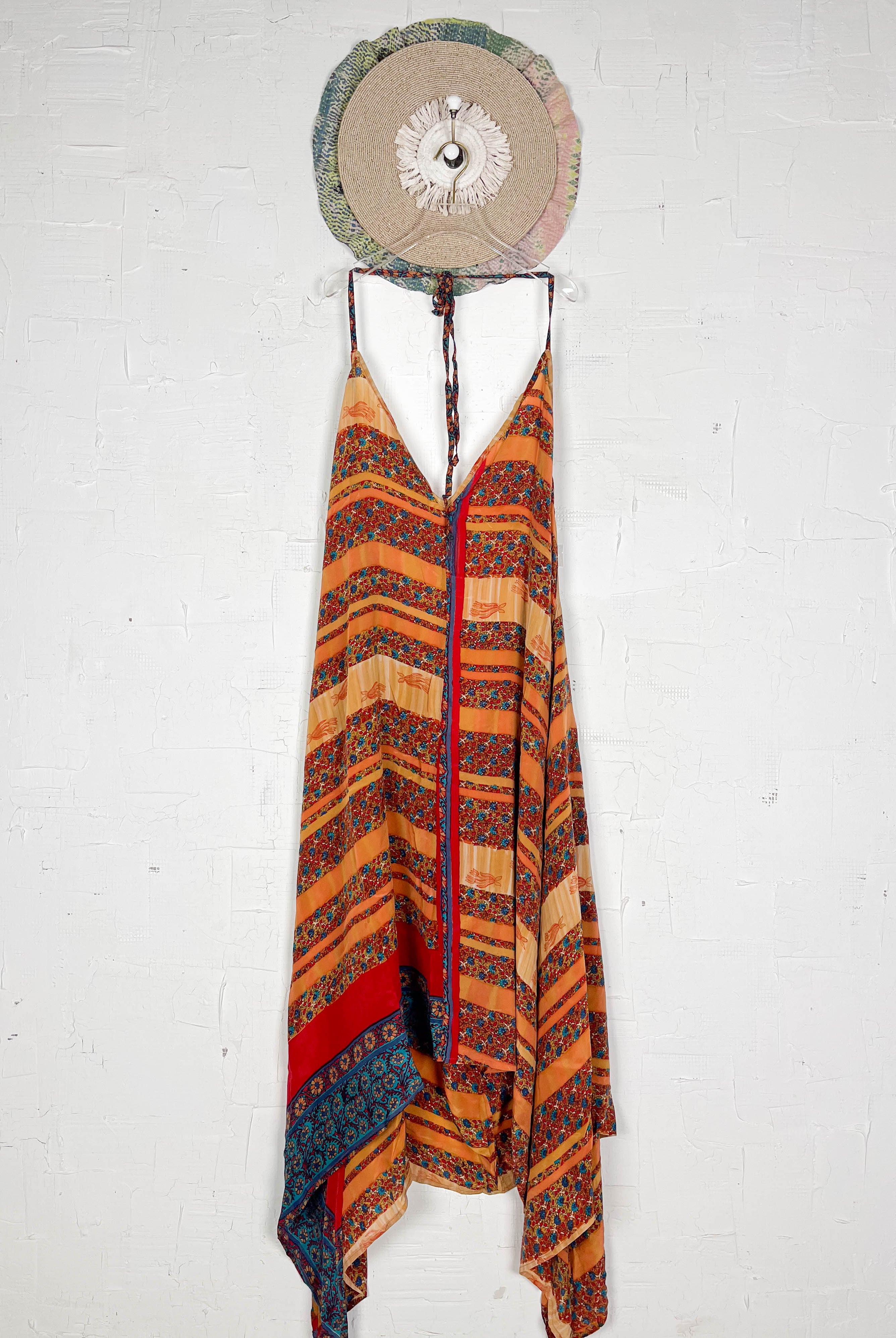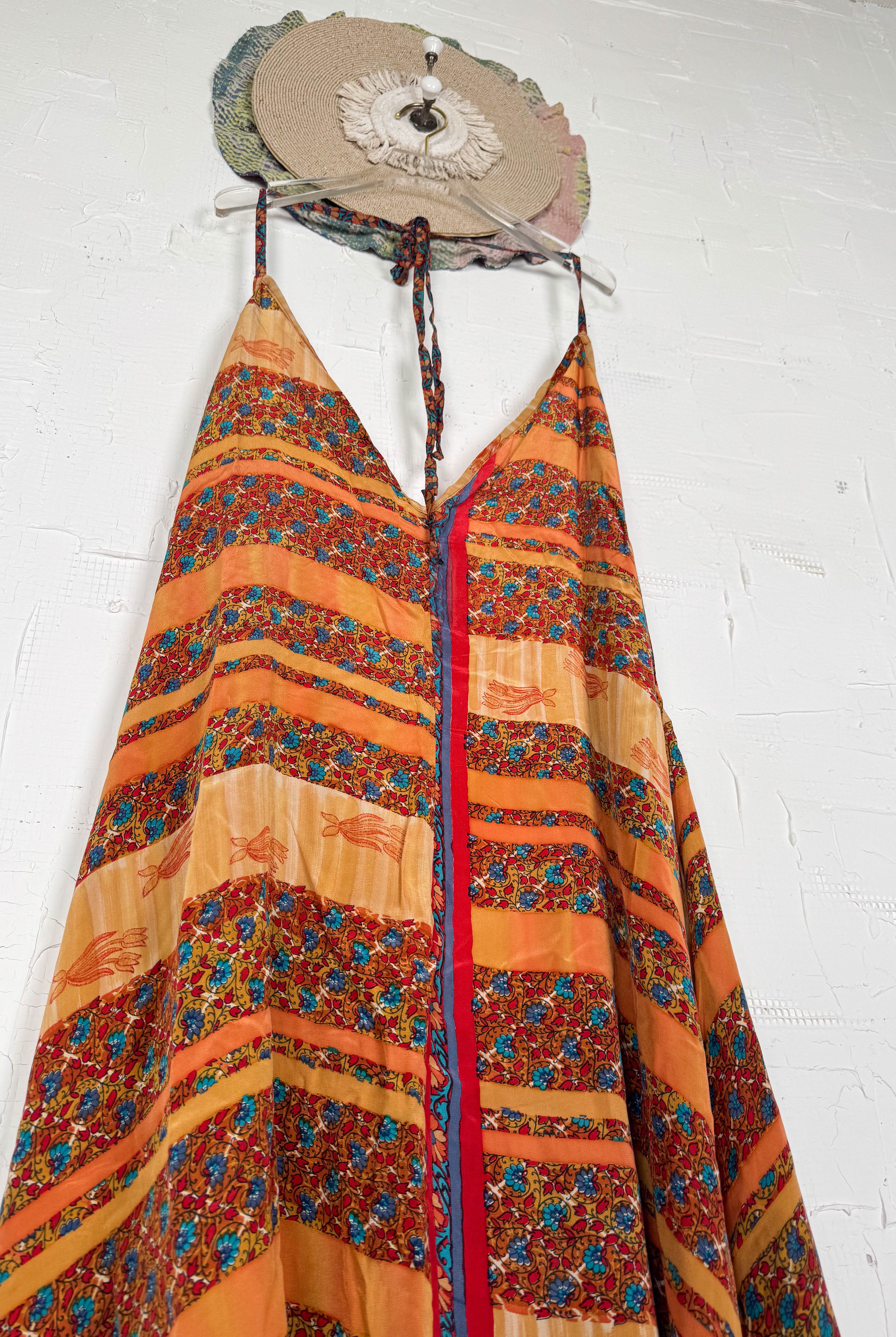 This "Effortless Grace" vintage silk dress offers a luxurious feel and a fluid drape that flatters all figures. Crafted with an adjustable back tie for a perfect fit, its chic halter neckline, unique floral pattern, and modern asymmetrical hemline combine to create a truly unique and memorable statement piece.