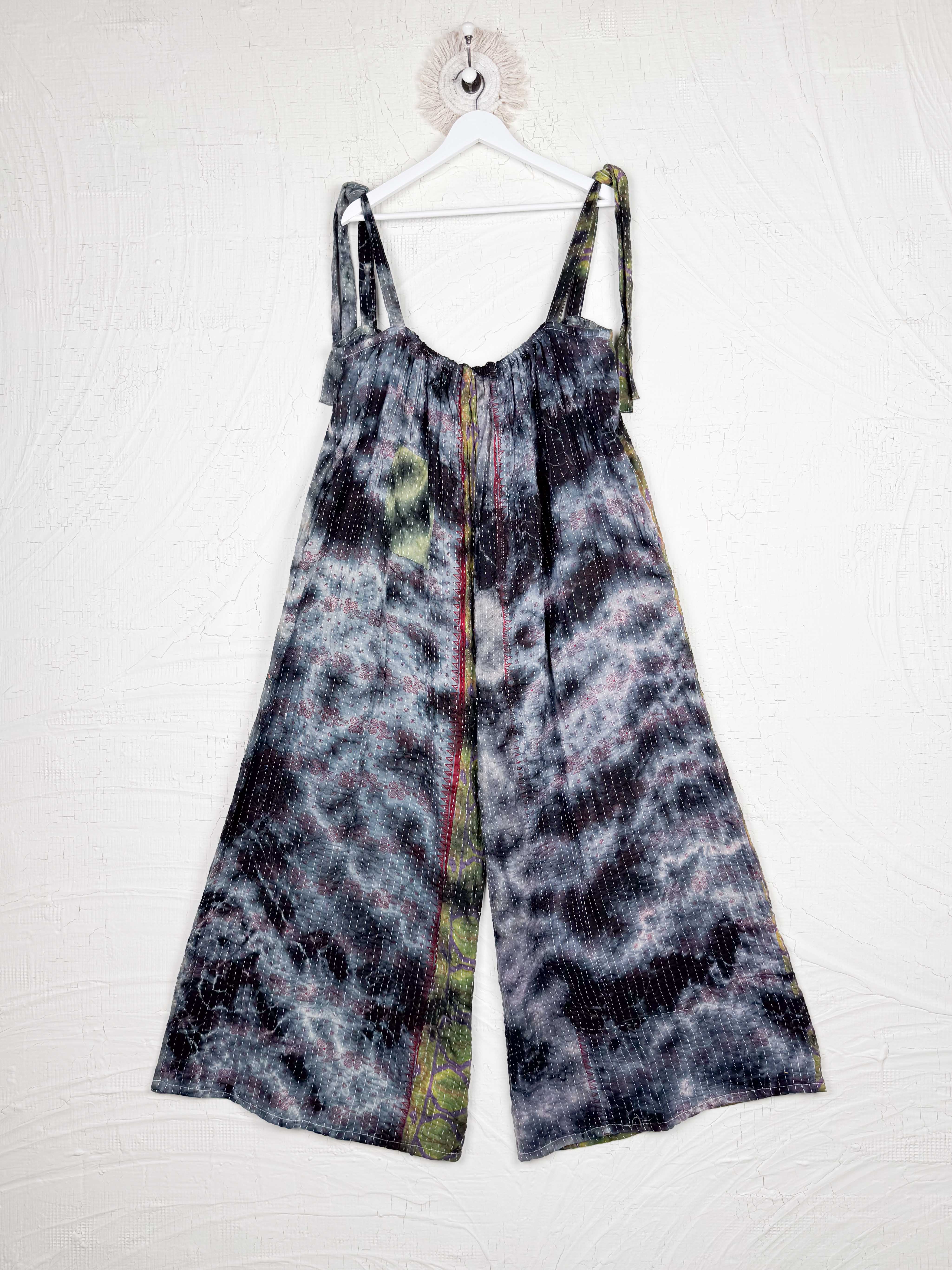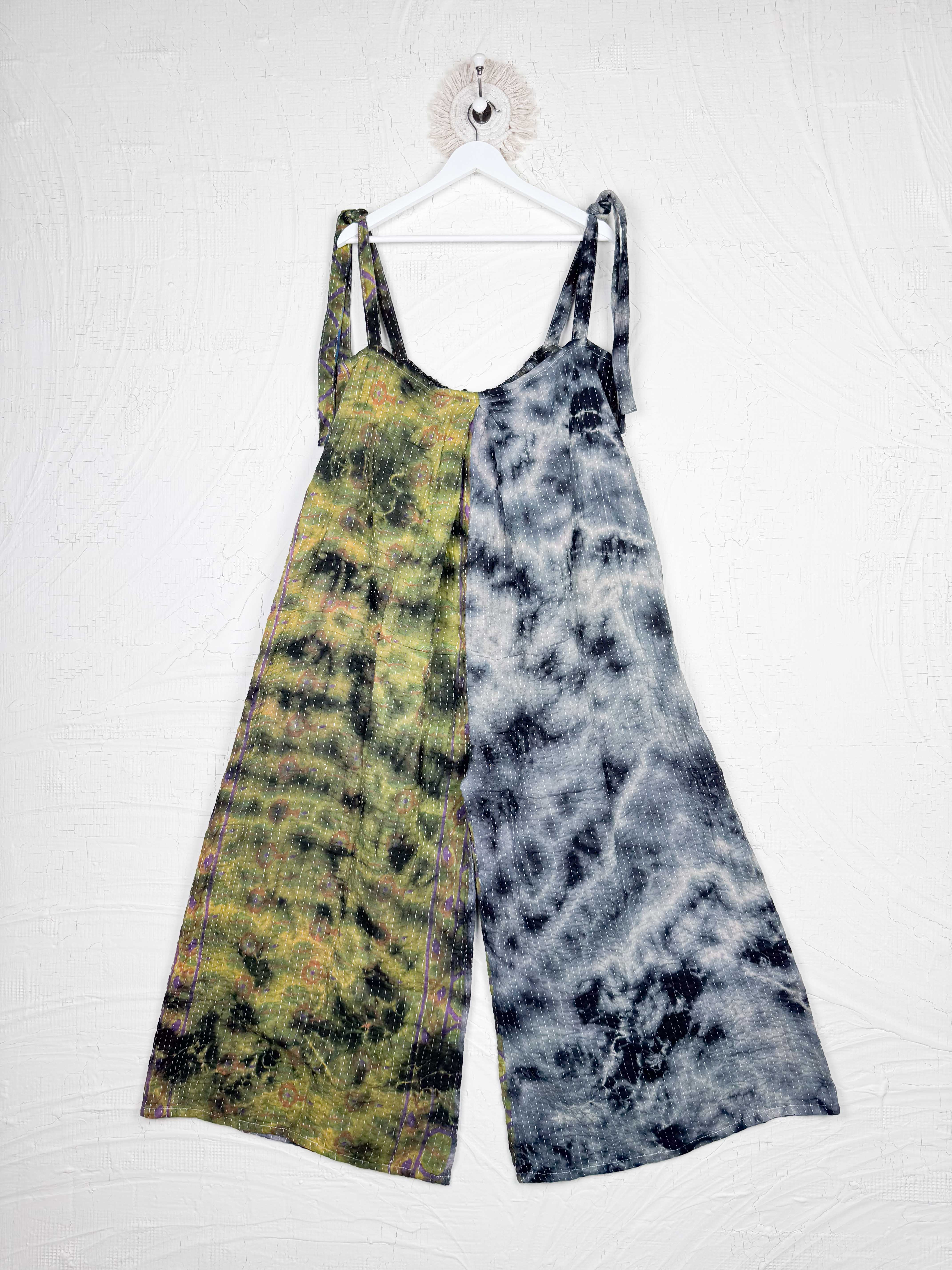 Dare to be unique and beautiful in this beautiful kantha jumpsuit, a blend of timeless artistry and free-spirited design. We combined the rich heritage of vintage Kantha work with the patchwork, creating a piece that's as unique as you are. Crafted from soft Kantha cotton, each patchwork detail carries a whisper of history, while the captivating matching patchwork bursts forth in stunning colors. The delicate square-neck with its tie closure offers a touch of personal style and breathable comfort. Long, wide legs enhance the relaxed, bohemian silhouette, perfect for expressing your inner wanderer. This jumpsuit flows effortlessly, designed to embrace your body with ease and confidence. The subtle texture of the Kantha stitches adds a handcrafted charm, a reminder to embrace your playful and authentic self.