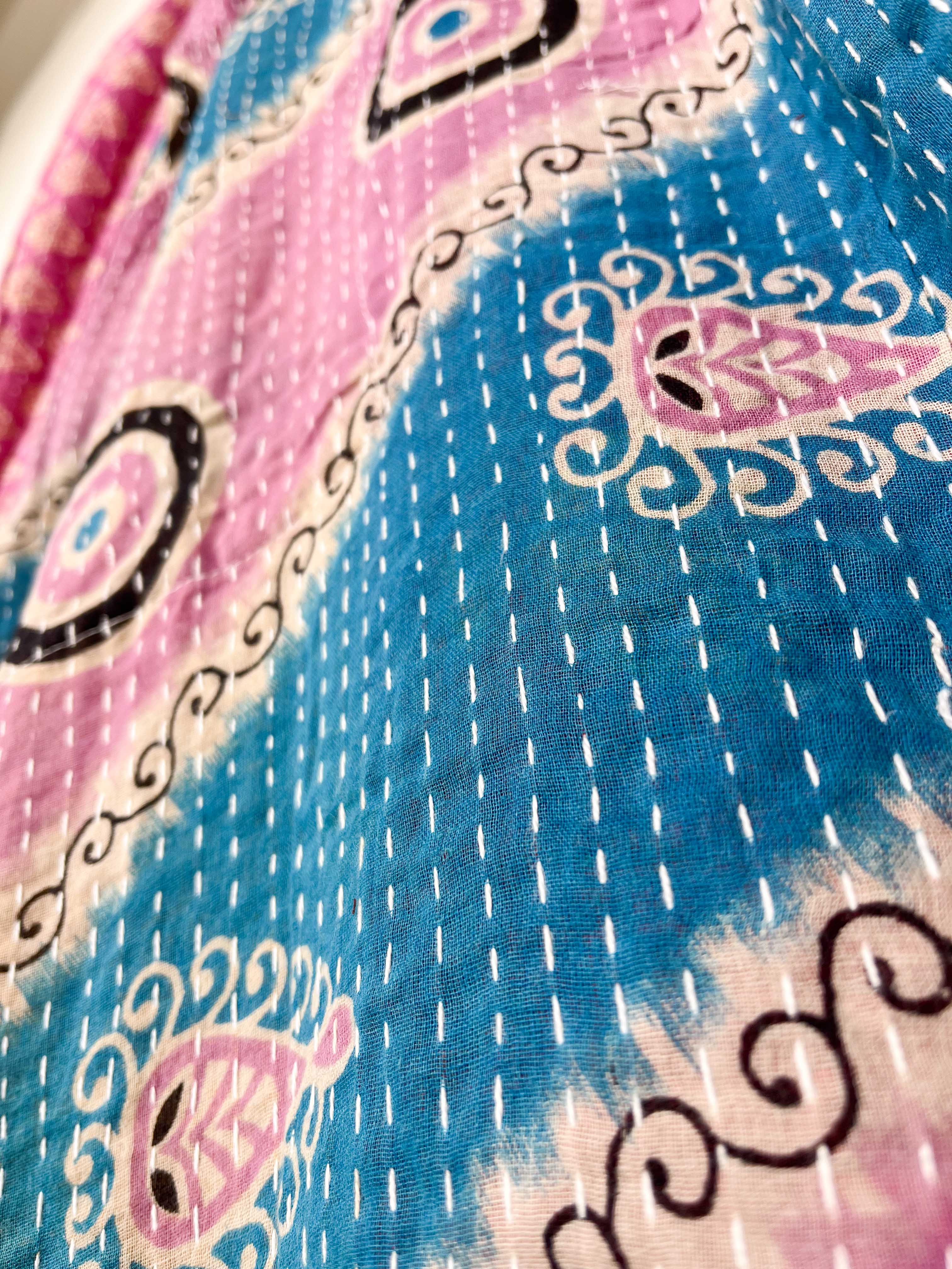 Dare to be unique and beautiful in this beautiful kantha jumpsuit, a blend of timeless artistry and free-spirited design. We combined the rich heritage of vintage Kantha work with the patchwork, creating a piece that's as unique as you are. Crafted from soft Kantha cotton, each patchwork detail carries a whisper of history, while the captivating matching patchwork bursts forth in stunning colors. The delicate square-neck with its tie closure offers a touch of personal style and breathable comfort. Long, wide legs enhance the relaxed, bohemian silhouette, perfect for expressing your inner wanderer. This jumpsuit flows effortlessly, designed to embrace your body with ease and confidence. The subtle texture of the Kantha stitches adds a handcrafted charm, a reminder to embrace your playful and authentic self.