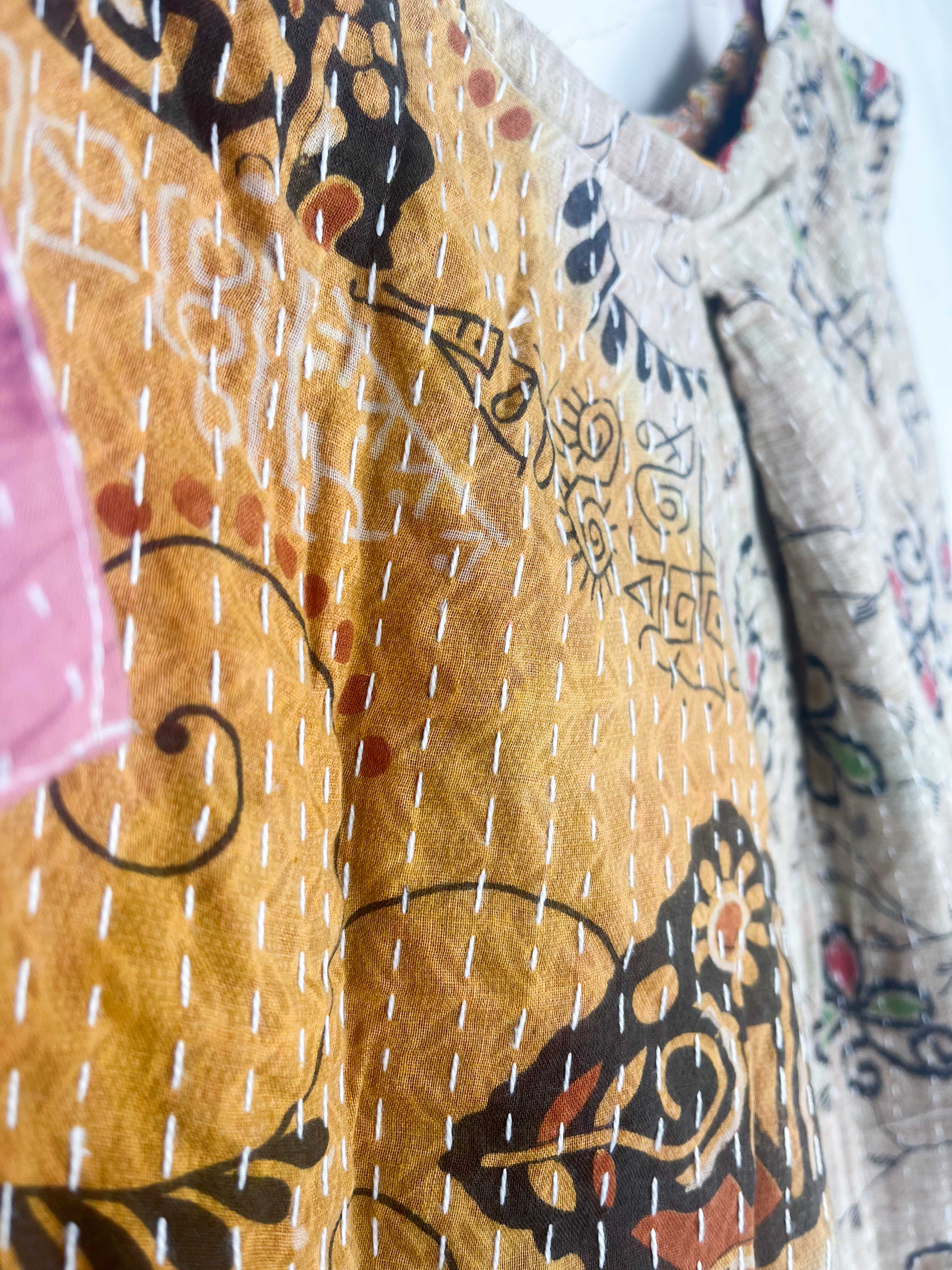 Dare to be unique and beautiful in this beautiful kantha jumpsuit, a blend of timeless artistry and free-spirited design. We combined the rich heritage of vintage Kantha work with the patchwork, creating a piece that's as unique as you are. Crafted from soft Kantha cotton, each patchwork detail carries a whisper of history, while the captivating matching patchwork bursts forth in stunning colors. The delicate square-neck with its tie closure offers a touch of personal style and breathable comfort. Long, wide legs enhance the relaxed, bohemian silhouette, perfect for expressing your inner wanderer. This jumpsuit flows effortlessly, designed to embrace your body with ease and confidence. The subtle texture of the Kantha stitches adds a handcrafted charm, a reminder to embrace your playful and authentic self.