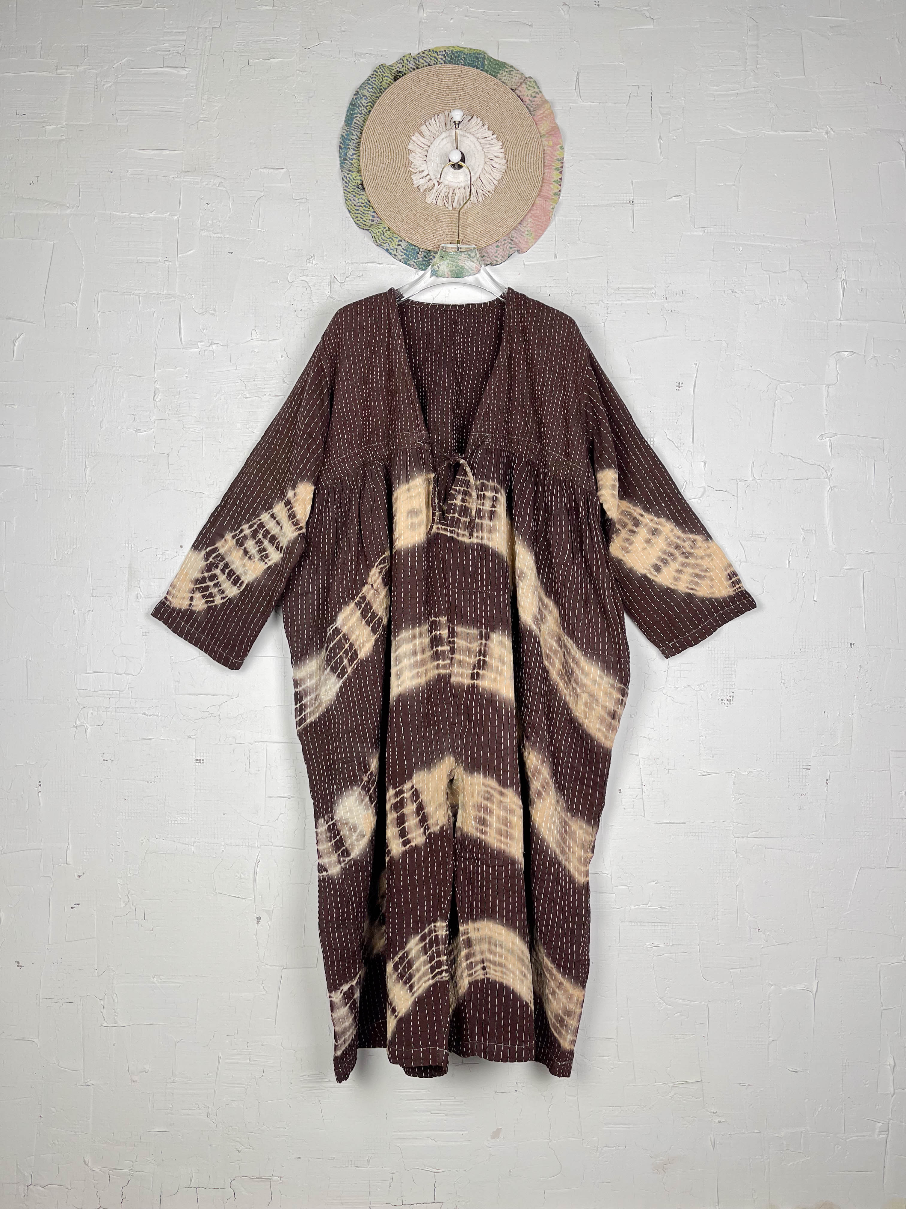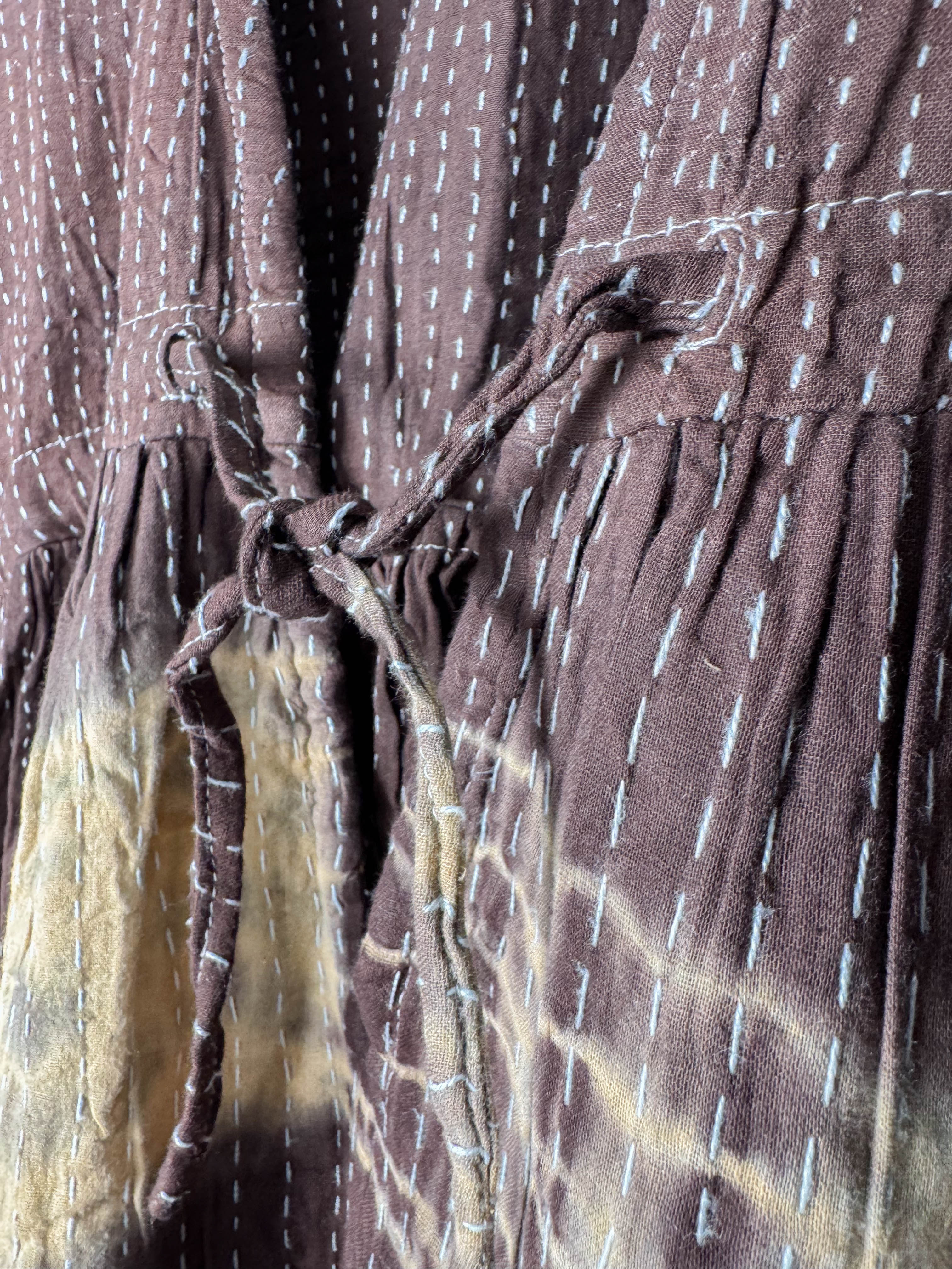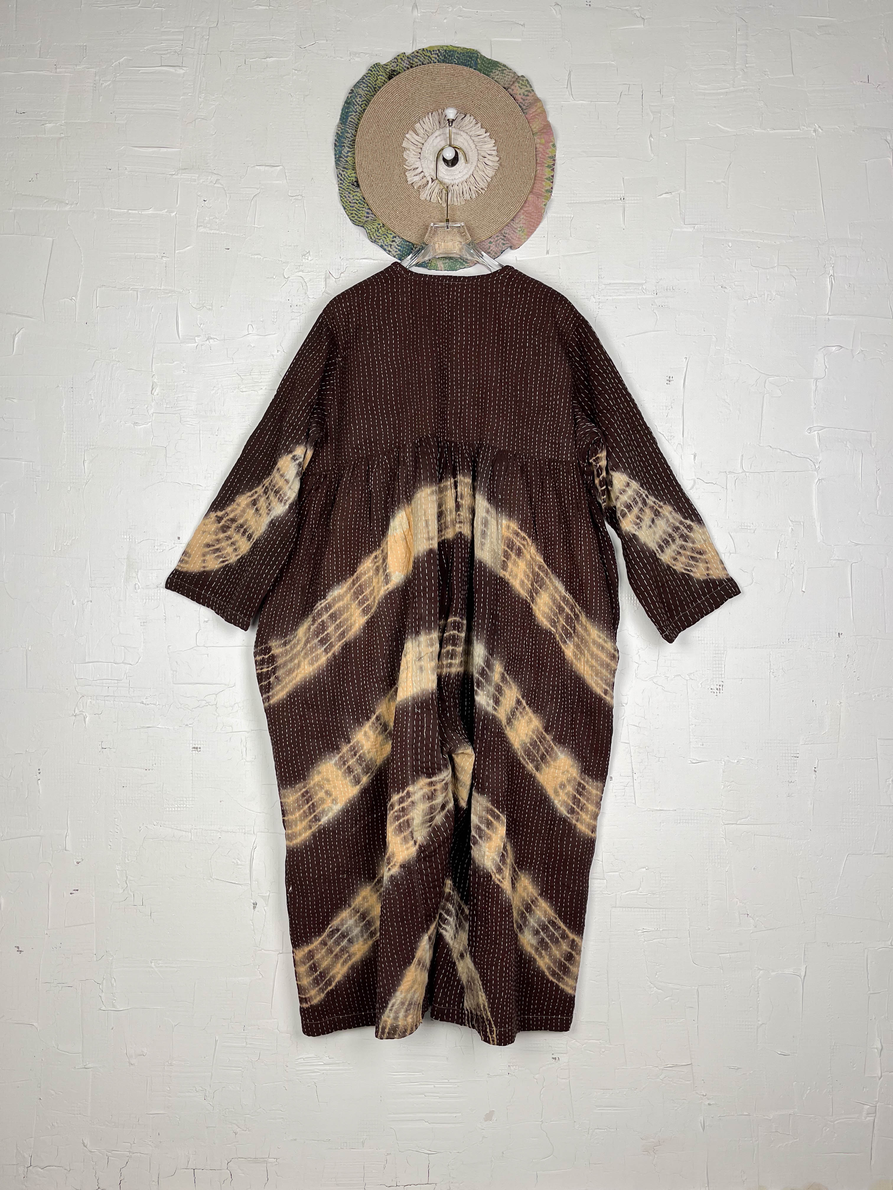 Dare to be unique and beautiful in this extraordinary jumpsuit, a blend of timeless artistry and free-spirited design. We combined the rich heritage of vintage Kantha work with the bold individuality of tie-dye, creating a piece that's as unique as you are. Crafted from soft Kantha cotton, each patchwork detail carries a whisper of history, while the captivating tie-dye pattern bursts forth in stunning colors. The delicate V-neck with its tie closure offers a touch of personal style and breathable comfort. Long, wide sleeves enhance the relaxed, bohemian silhouette, perfect for expressing your inner wanderer. This jumpsuit flows effortlessly, designed to embrace your body with ease and confidence. The subtle texture of the Kantha stitches adds a handcrafted charm, a reminder to embrace your playful and authentic self.
