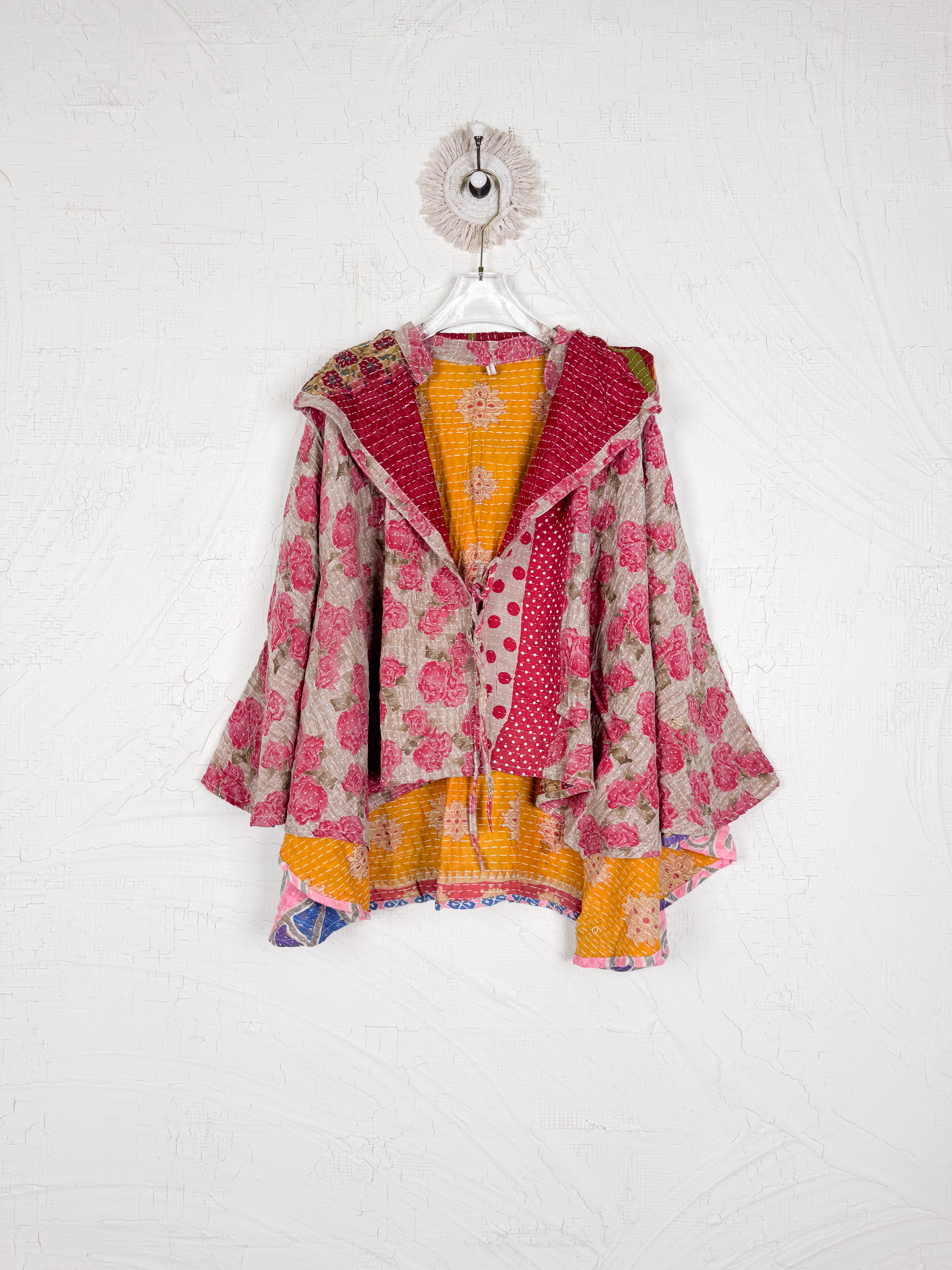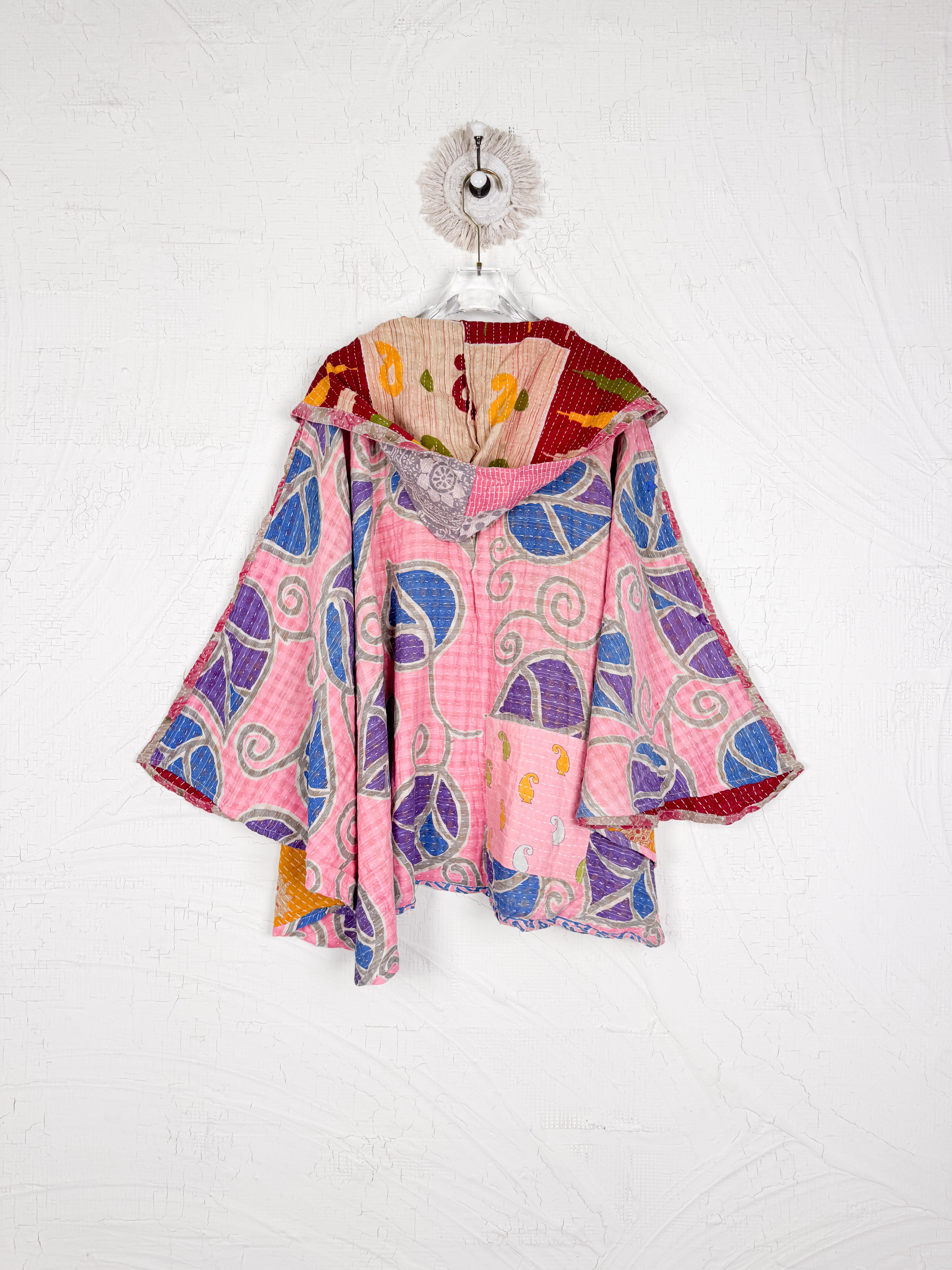 Handcrafted in India, this mid-length poncho dress is a unique piece of wearable art made from vintage Kantha fabric. Its beauty lies in the diverse tapestry of hand-stitched fabric patterns and colours, a hallmark of traditional Kantha patchwork.Designed for effortless style, it drapes gracefully with a wide, open silhouette, a comfortable