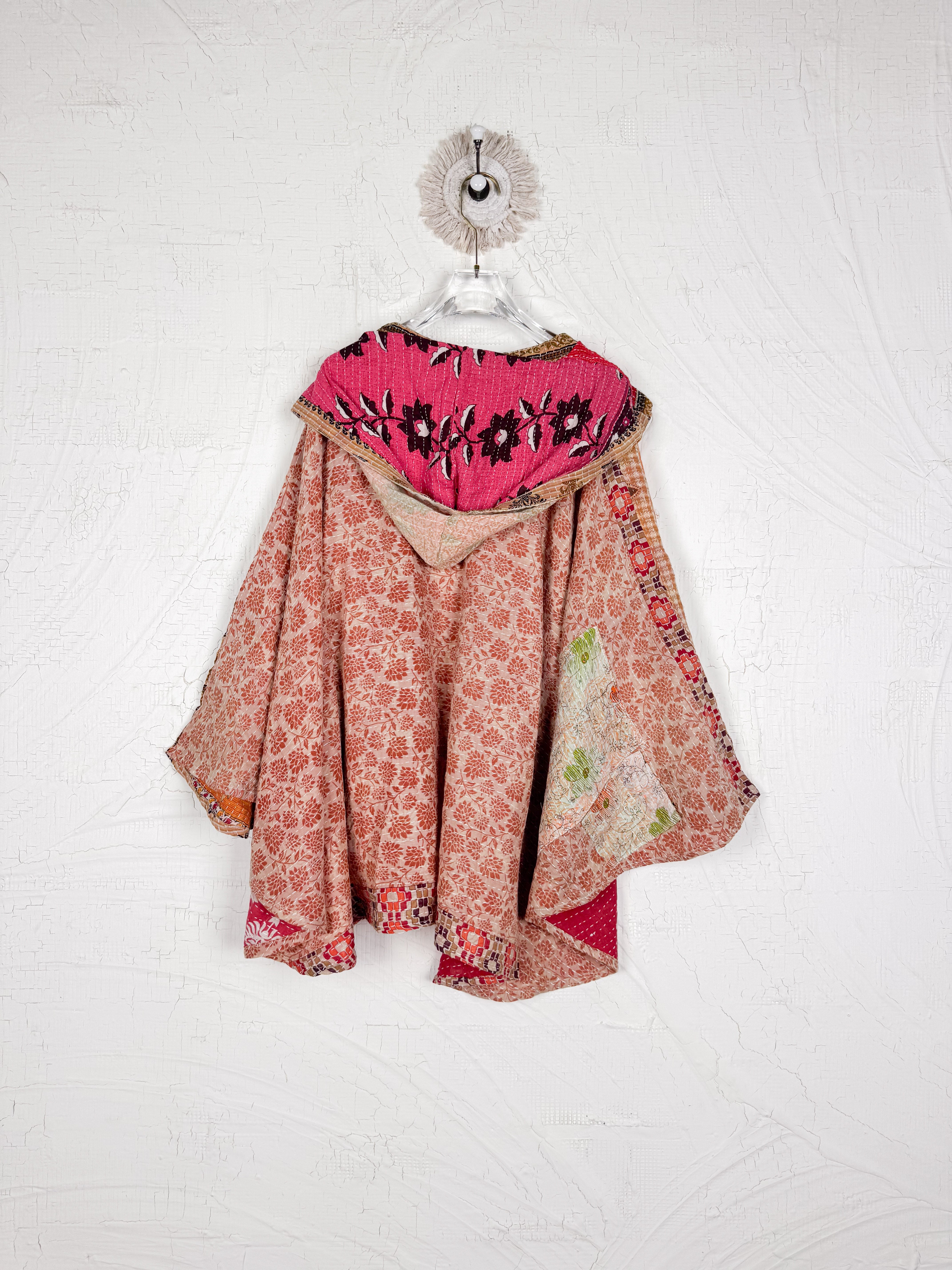 Handcrafted in India, this mid-length poncho dress is a unique piece of wearable art made from vintage Kantha fabric. Its beauty lies in the diverse tapestry of hand-stitched fabric patterns and colours, a hallmark of traditional Kantha patchwork.Designed for effortless style, it drapes gracefully with a wide, open silhouette, a comfortable