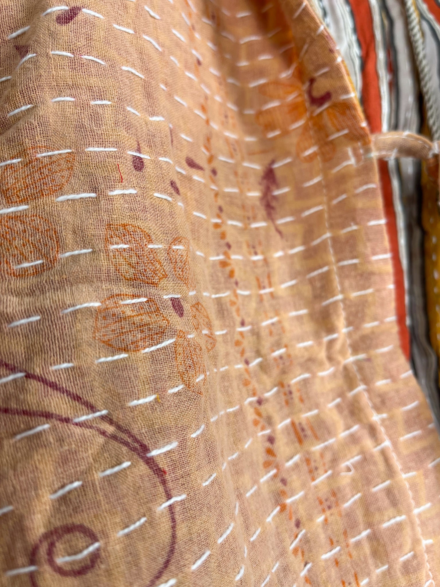 this is Kantha stitches all over the fabric. this kantha work is done by layering 2 or more cotton sarees over each other and stitched them all over the span to get the desired thickness depending upon the number of sarees put in layers, the texture of the stitch all over and the floral prints of cotton make it unique