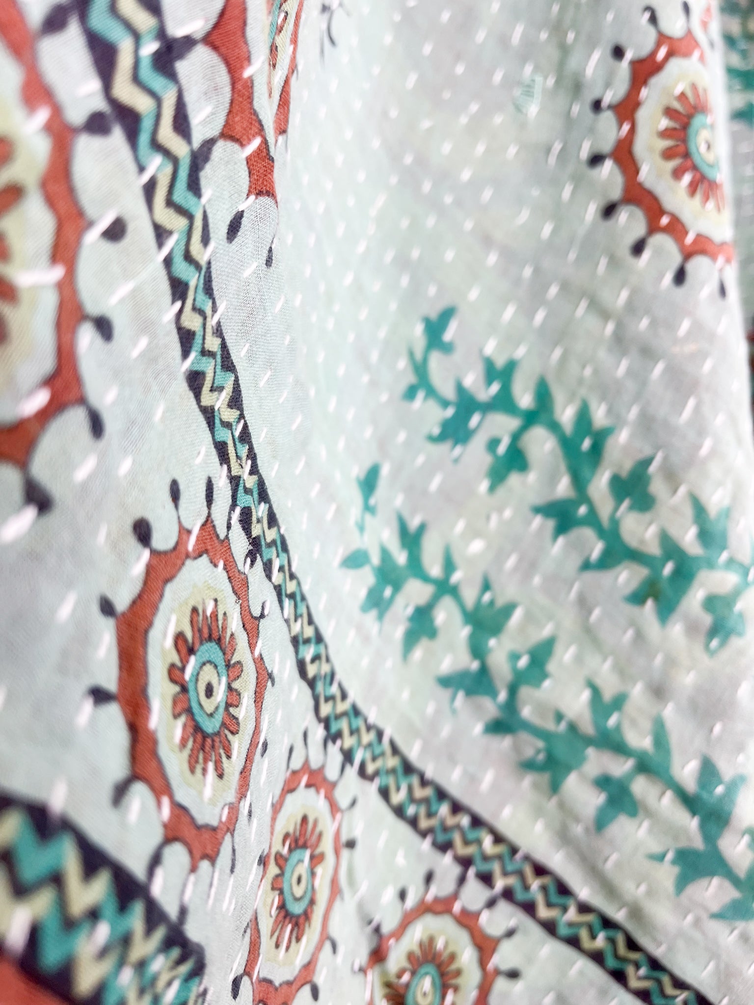 this is Kantha stitches all over the fabric. this kantha work is done by layering 2 or more cotton sarees over each other and stitched them all over the span to get the desired thickness depending upon the number of sarees put in layers, the texture of the stitch all over and the floral prints of cotton make it unique