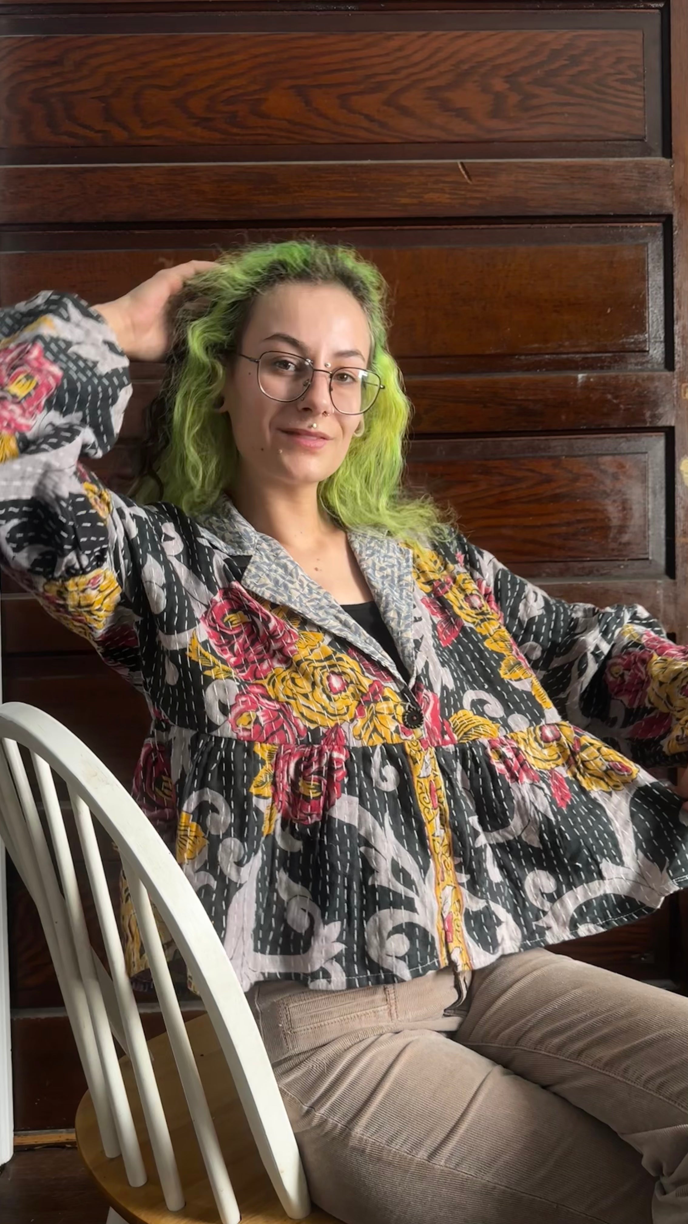 This is Vintage Kantha. we take Indian Kantha, which are often worn by people in different regions so the sarees consist of different prints and colours representing traditional values and vintage prints. we take the silk from Indian pre-loved sarees to make dresses