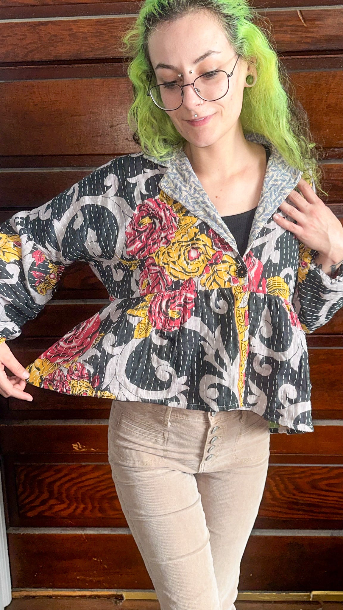 This is Vintage Kantha. we take Indian Kantha, which are often worn by people in different regions so the sarees consist of different prints and colours representing traditional values and vintage prints. we take the silk from Indian pre-loved sarees to make dresses