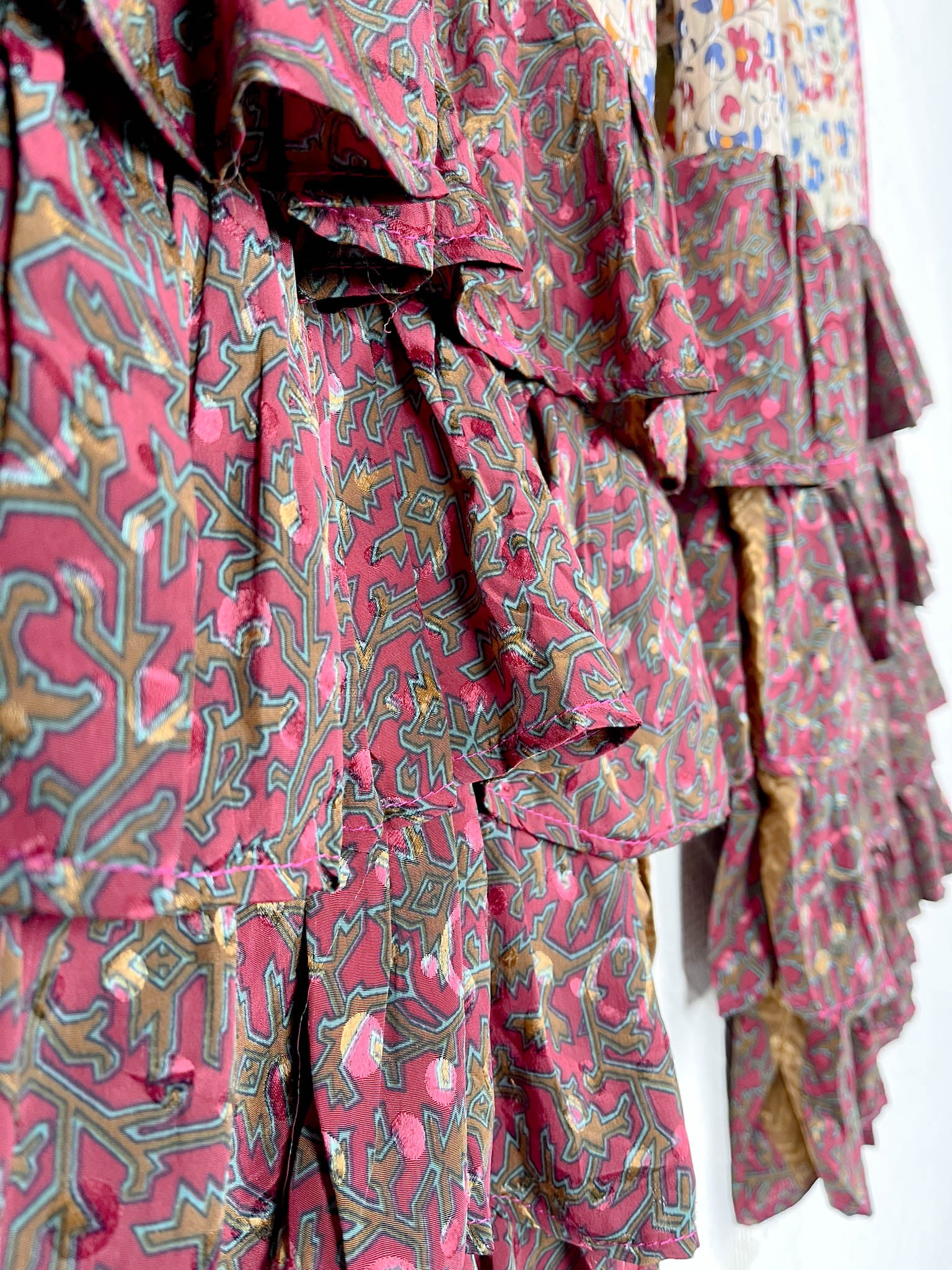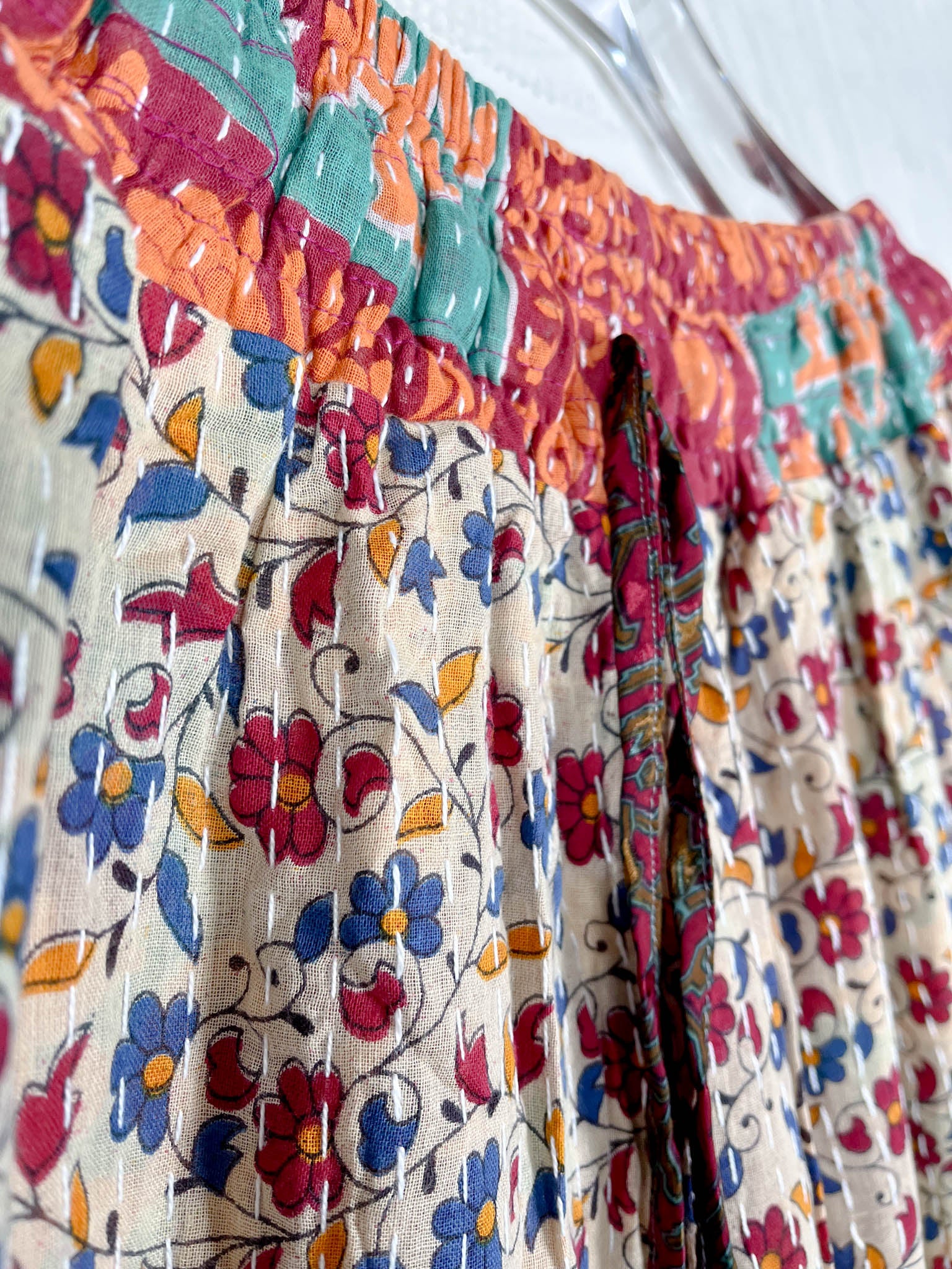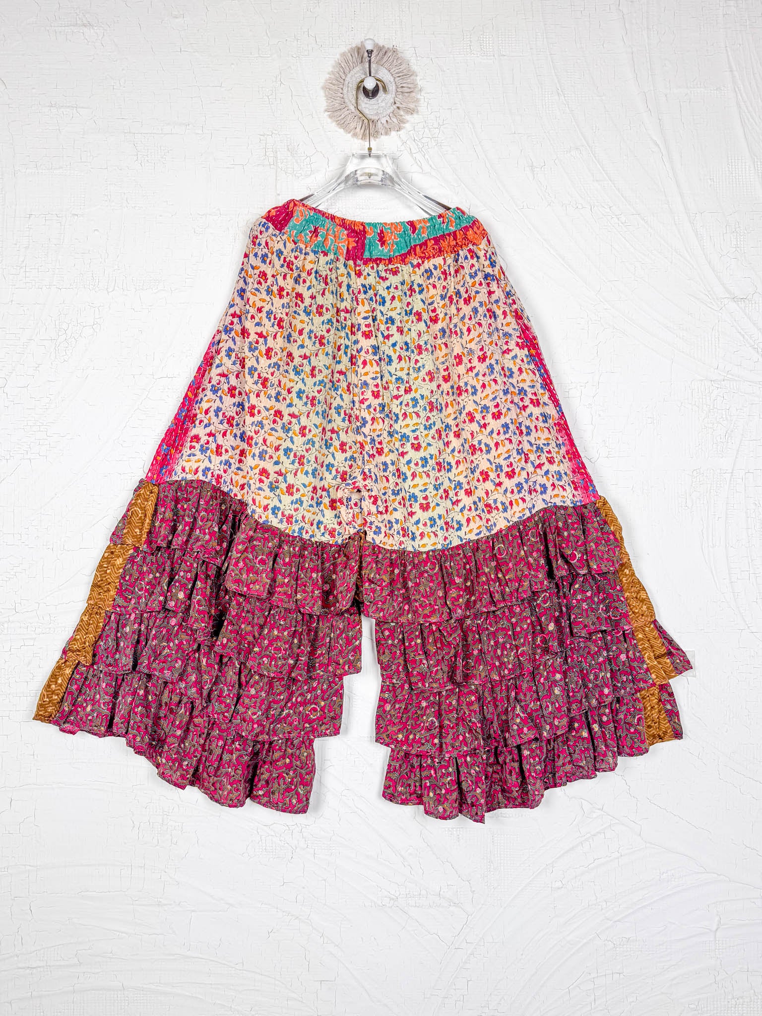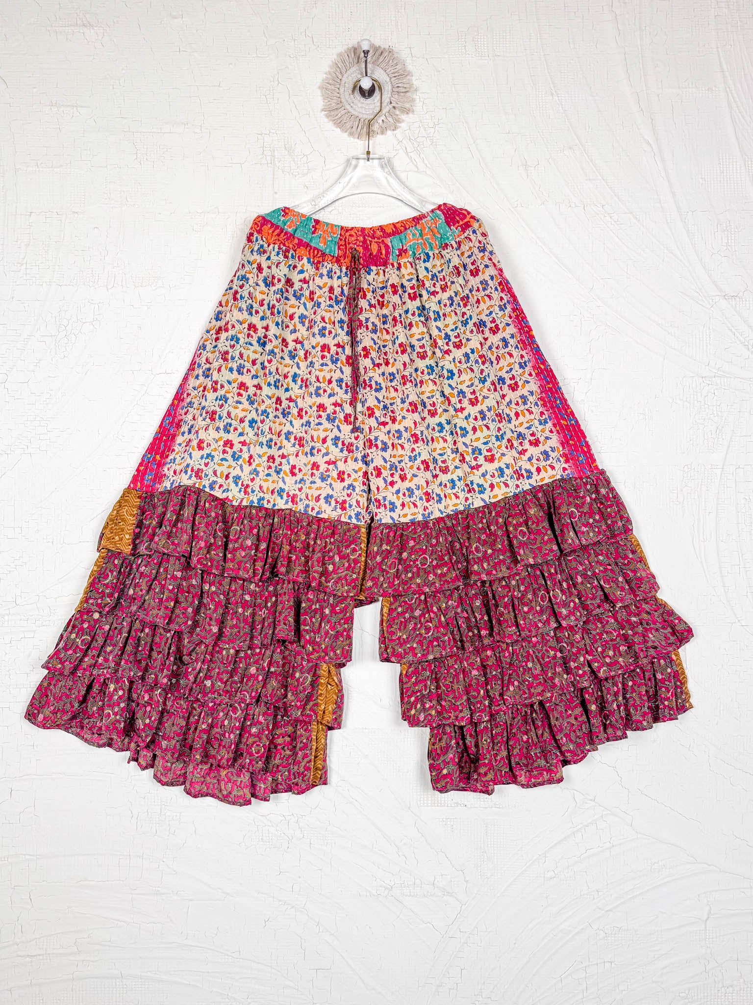 Imagine slipping into the embrace of vintage Kantha and Vintage Silk, reborn into these exquisite Frill Pants. These pants move and dance along with you! Allowing your Playful feminine essence to shine. Each delicate stitch of Kantha is a testament to time-honoured artistry and vibrant floral prints, breathing life and unique texture into the fabric. Feel the answer as you walk! These aren't just pants but a blend of traditional handwork and contemporary styling, where the gentle sway of silk meets the intricate beauty of Kantha, enhancing your every movement with grace and charm.