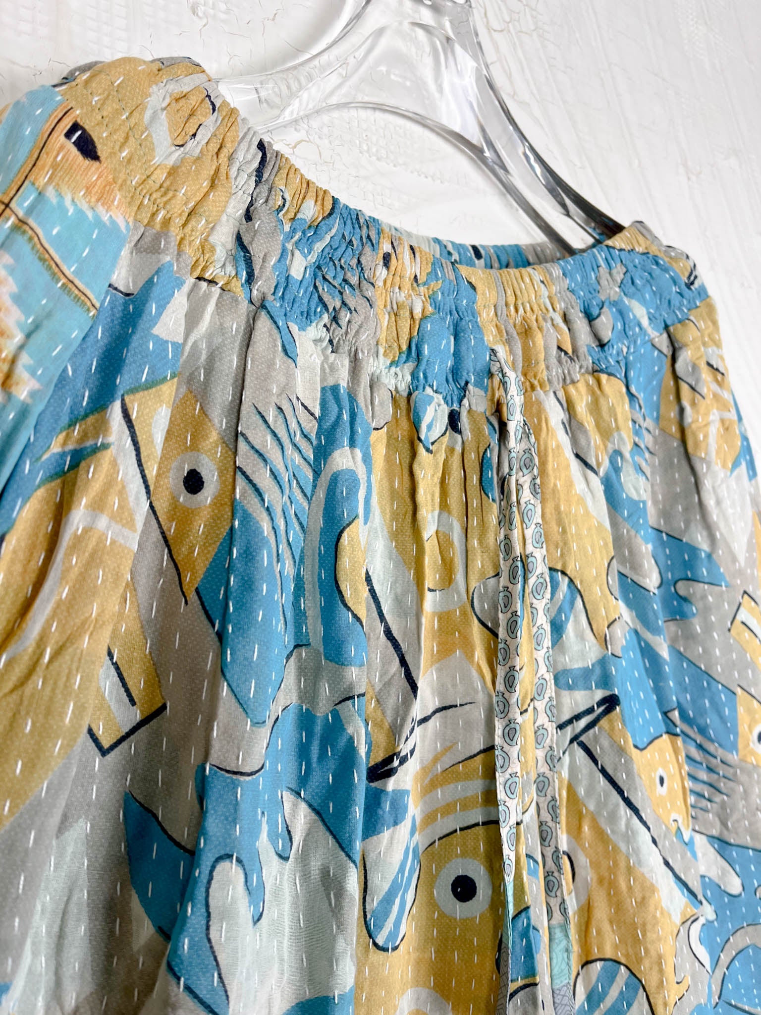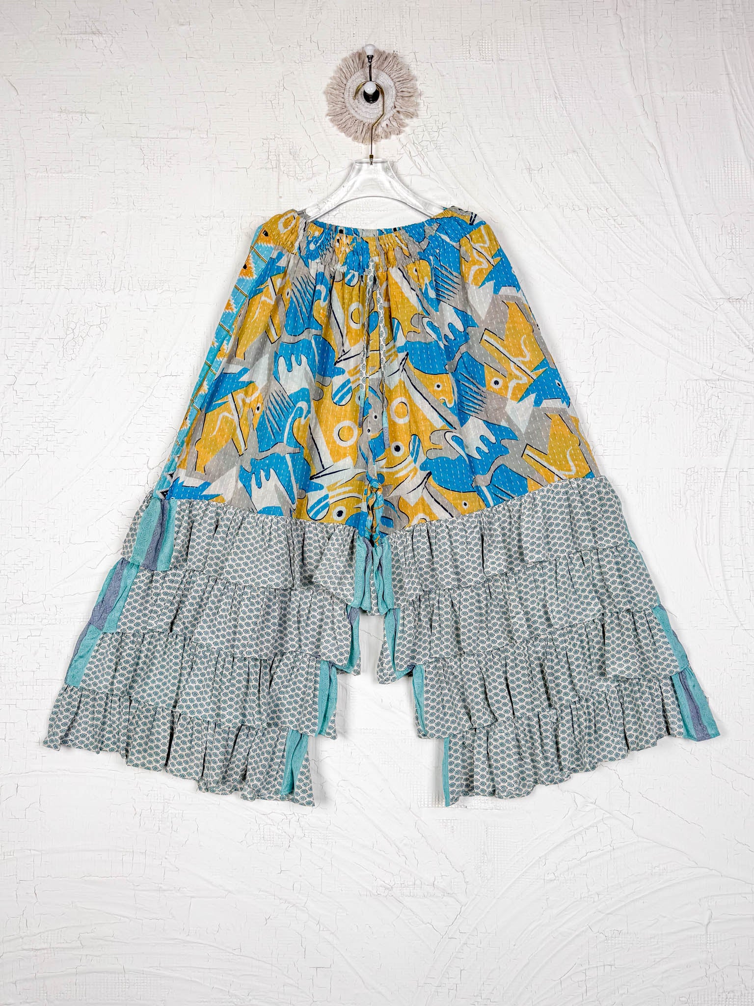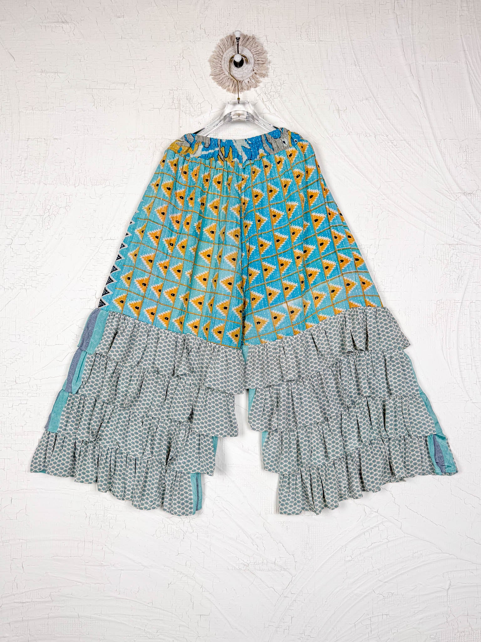 Imagine slipping into the embrace of vintage Kantha and Vintage Silk, reborn into these exquisite Frill Pants. These pants move and dance along with you! Allowing your Playful feminine essence to shine. Each delicate stitch of Kantha is a testament to time-honoured artistry and vibrant floral prints, breathing life and unique texture into the fabric. Feel the answer as you walk! These aren't just pants but a blend of traditional handwork and contemporary styling, where the gentle sway of silk meets the intricate beauty of Kantha, enhancing your every movement with grace and charm.
