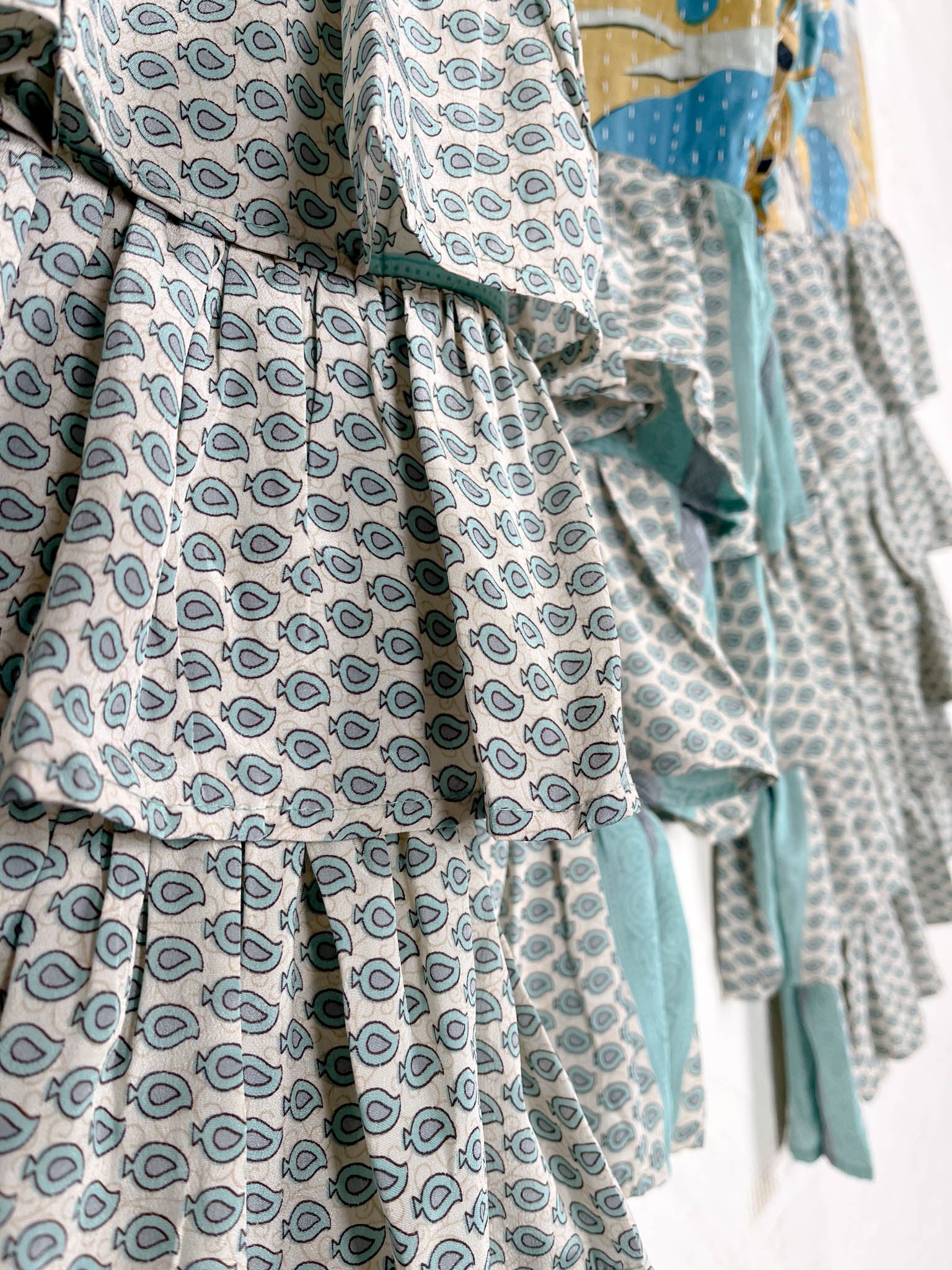 How does this beauty move? As you walk or twirl, the flowy silk cascades into playful frills at the hem, creating an enchanting wave with every step you take!