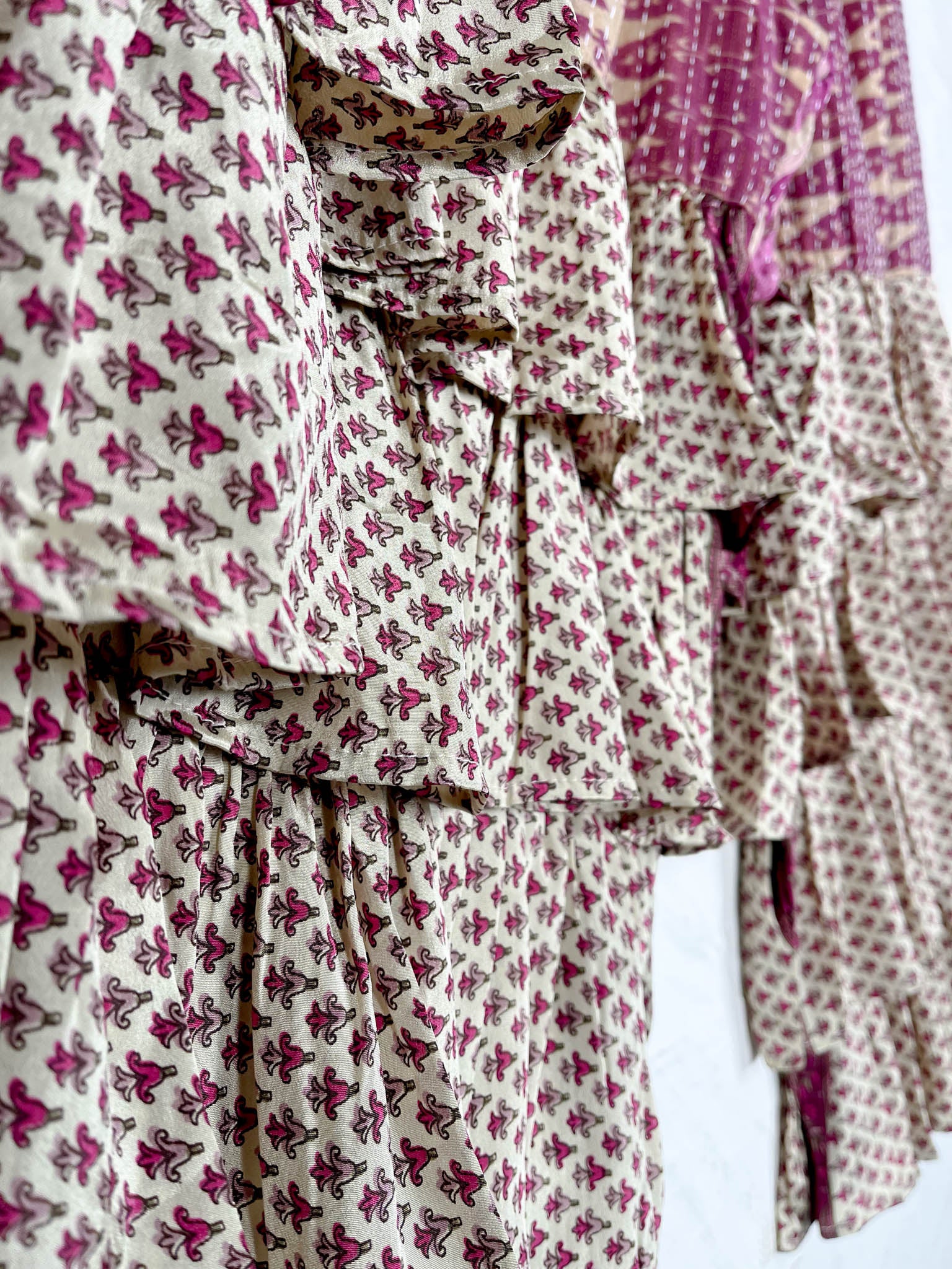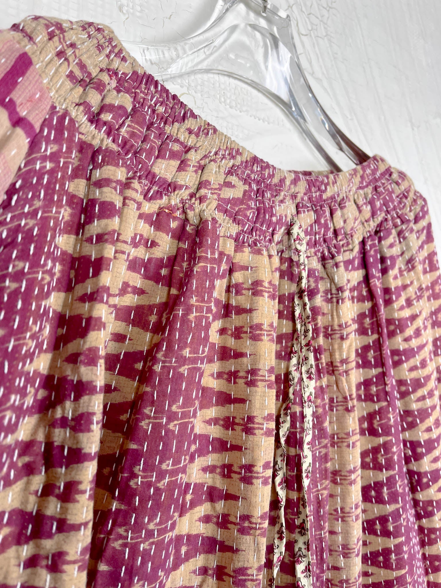 Imagine slipping into the embrace of vintage Kantha and Vintage Silk, reborn into these exquisite Frill Pants. These pants move and dance along with you! Allowing your Playful feminine essence to shine. Each delicate stitch of Kantha is a testament to time-honoured artistry and vibrant floral prints, breathing life and unique texture into the fabric. Feel the answer as you walk! These aren't just pants but a blend of traditional handwork and contemporary styling, where the gentle sway of silk meets the intricate beauty of Kantha, enhancing your every movement with grace and charm.