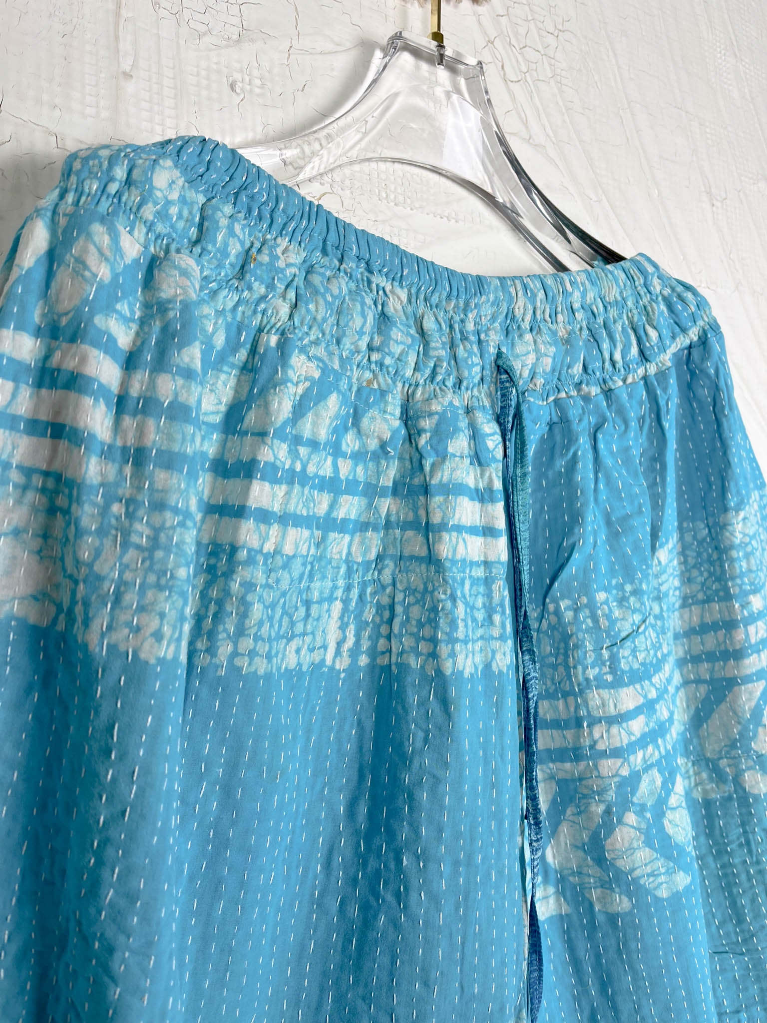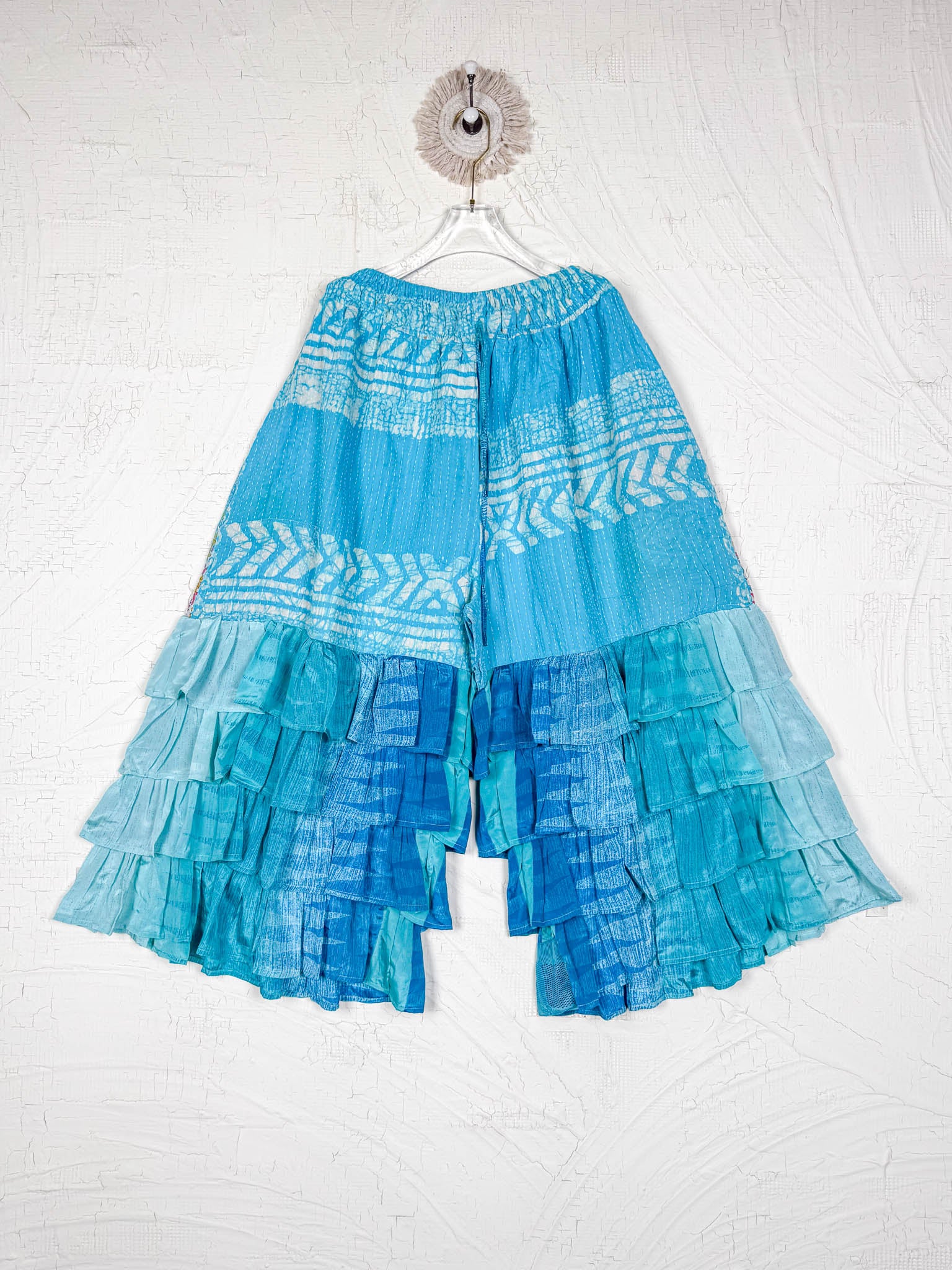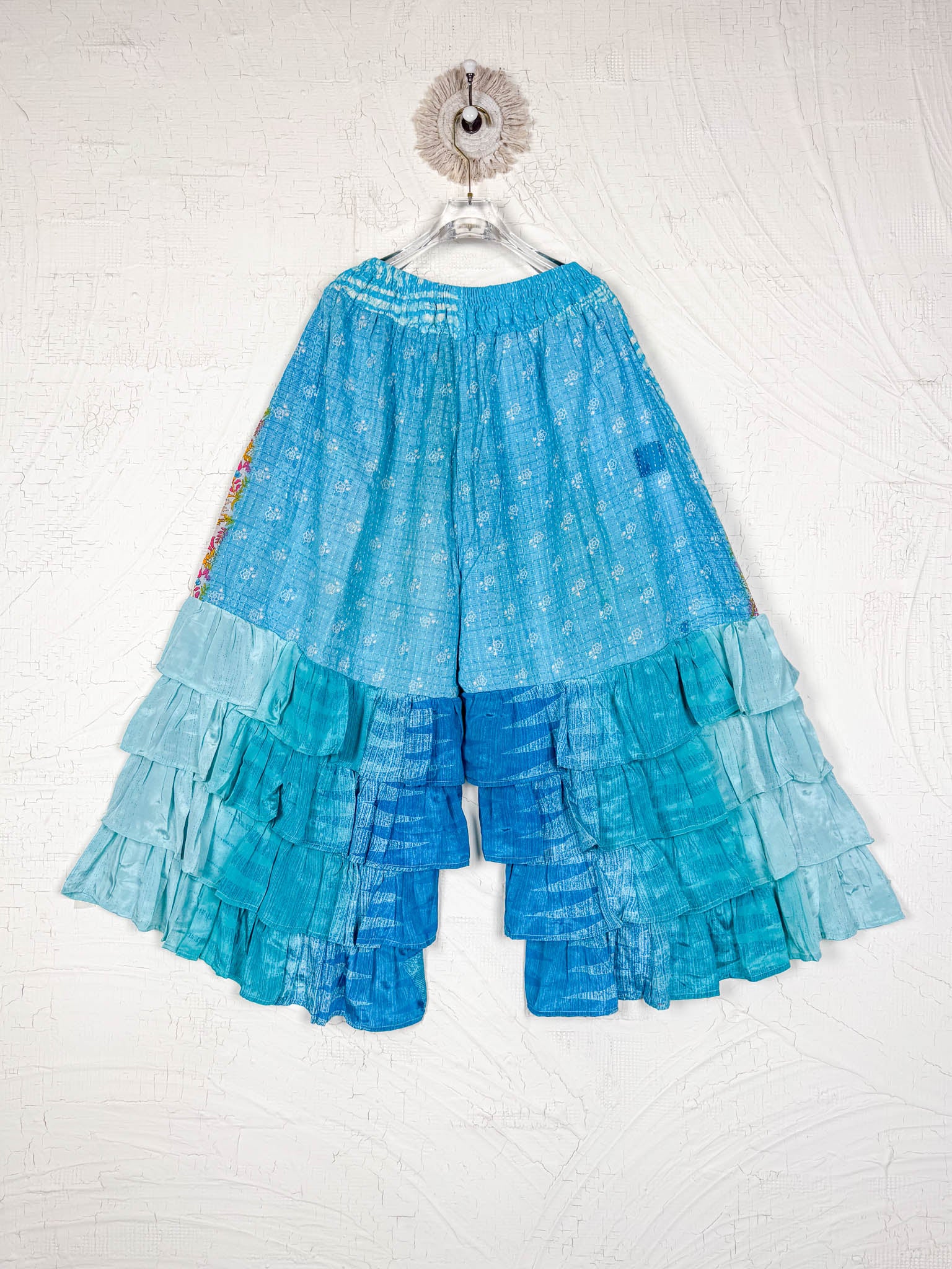 Imagine slipping into the embrace of vintage Kantha and Vintage Silk, reborn into these exquisite Frill Pants. These pants move and dance along with you! Allowing your Playful feminine essence to shine. Each delicate stitch of Kantha is a testament to time-honoured artistry and vibrant floral prints, breathing life and unique texture into the fabric. Feel the answer as you walk! These aren't just pants but a blend of traditional handwork and contemporary styling, where the gentle sway of silk meets the intricate beauty of Kantha, enhancing your every movement with grace and charm.