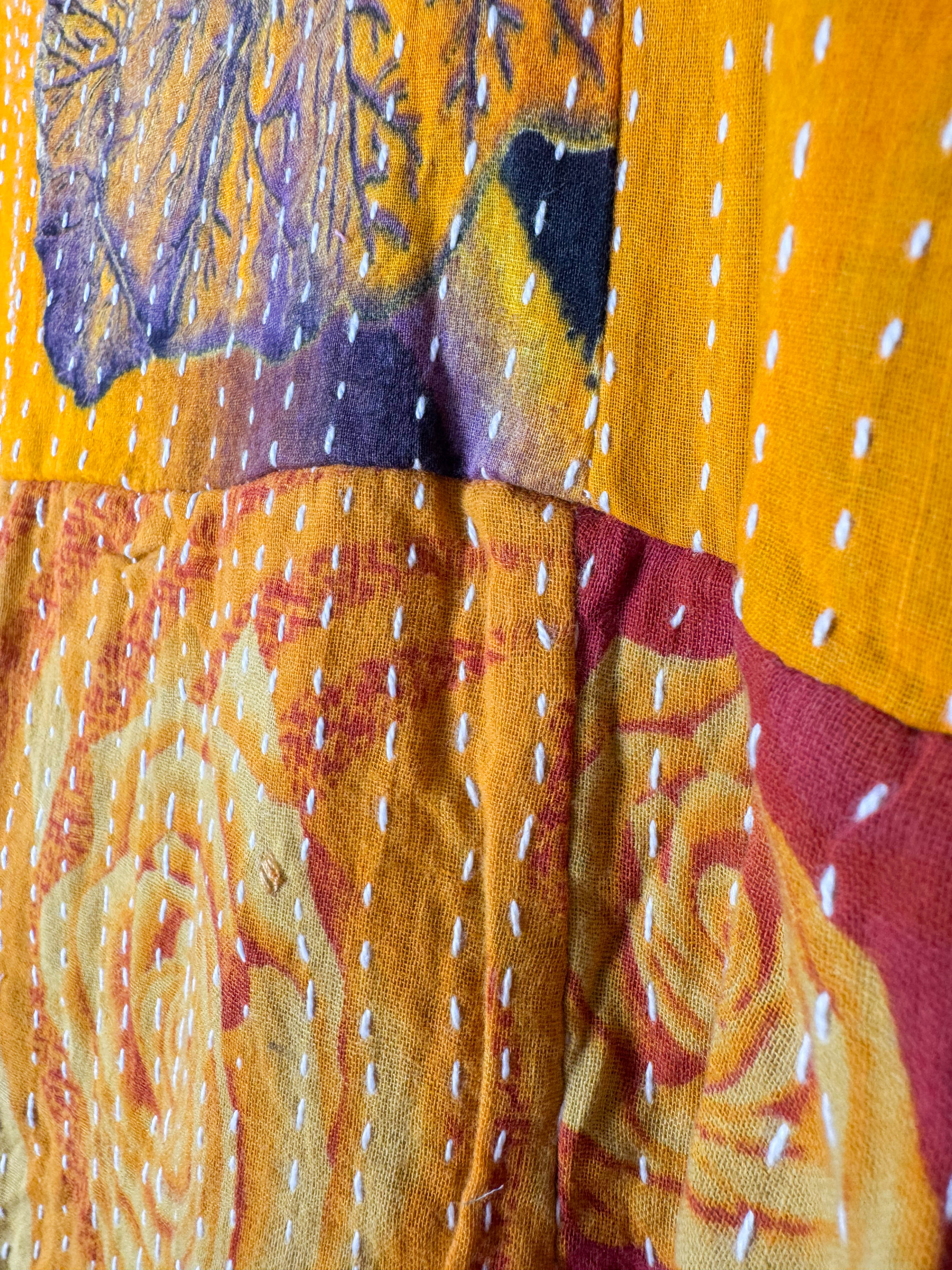 Envelop yourself in the artistry of this vintage Kantha dress. Each running stitch tells a story across the lightweight fabric, creating a unique texture and a beautifully airy feel. A long slit graces the left side, adding a touch of distinctive charm. Experience the seamless harmony of traditional hand craftsmanship and everyday ease to enhance your Playful feminine essence every day!