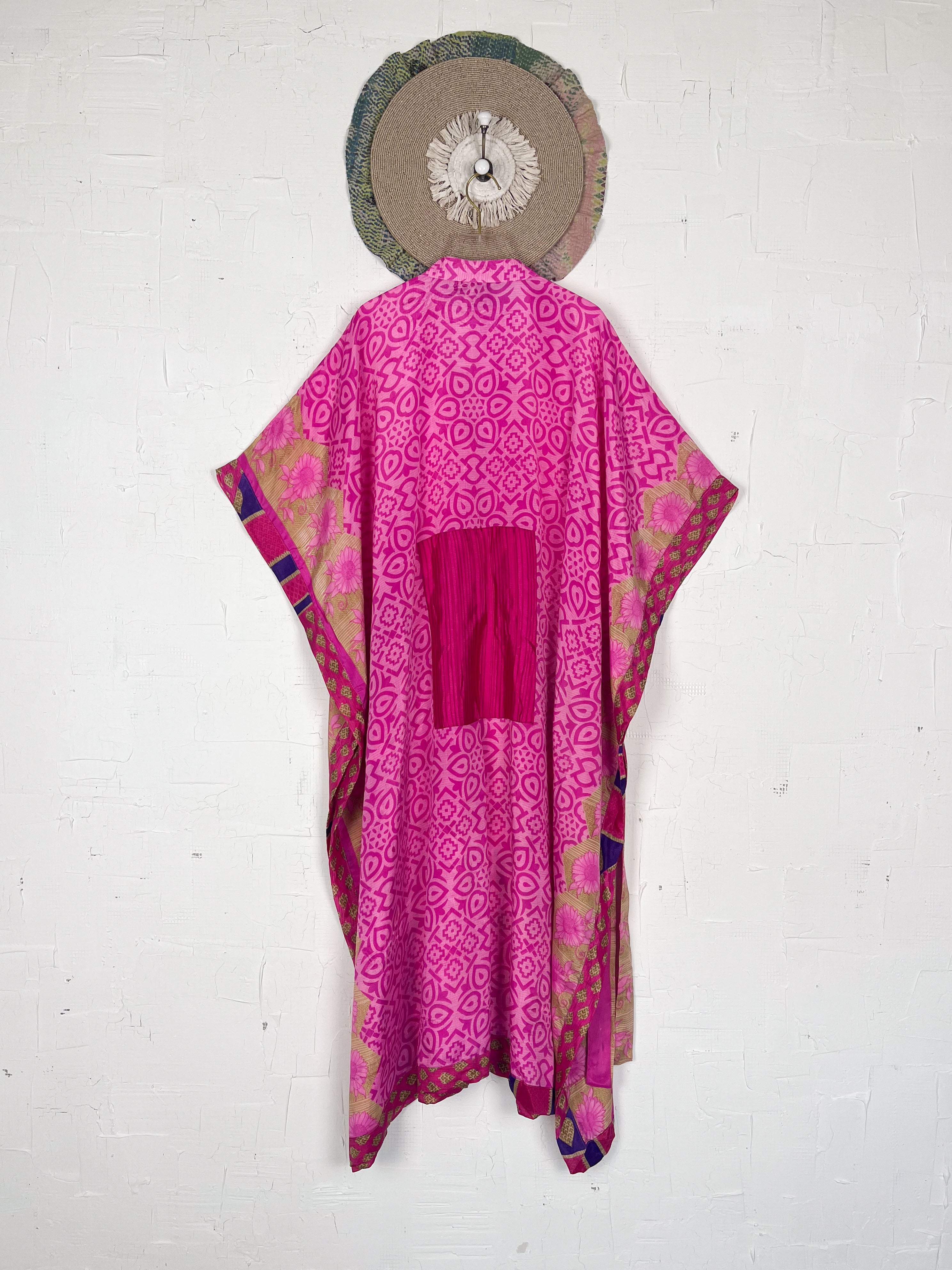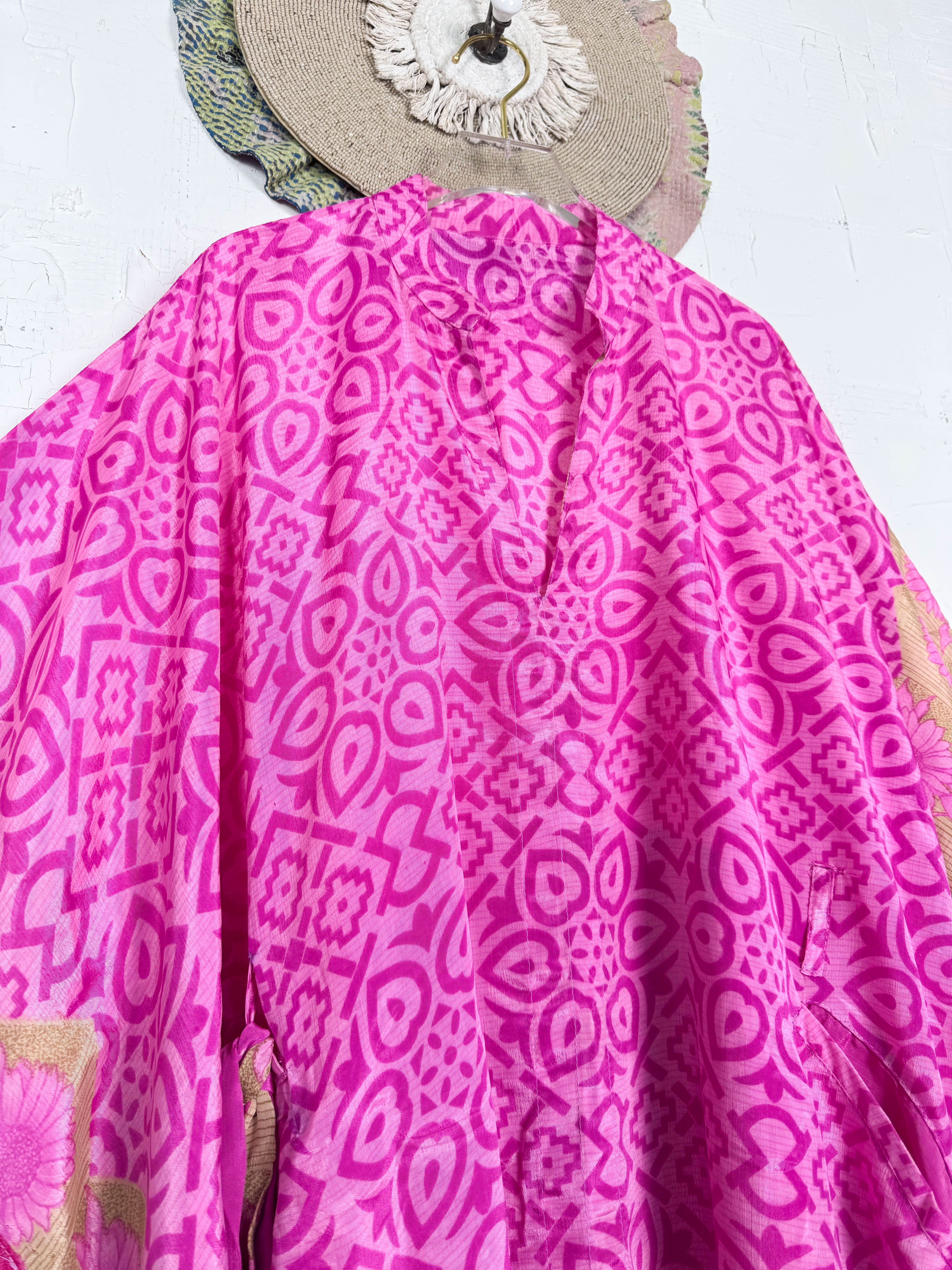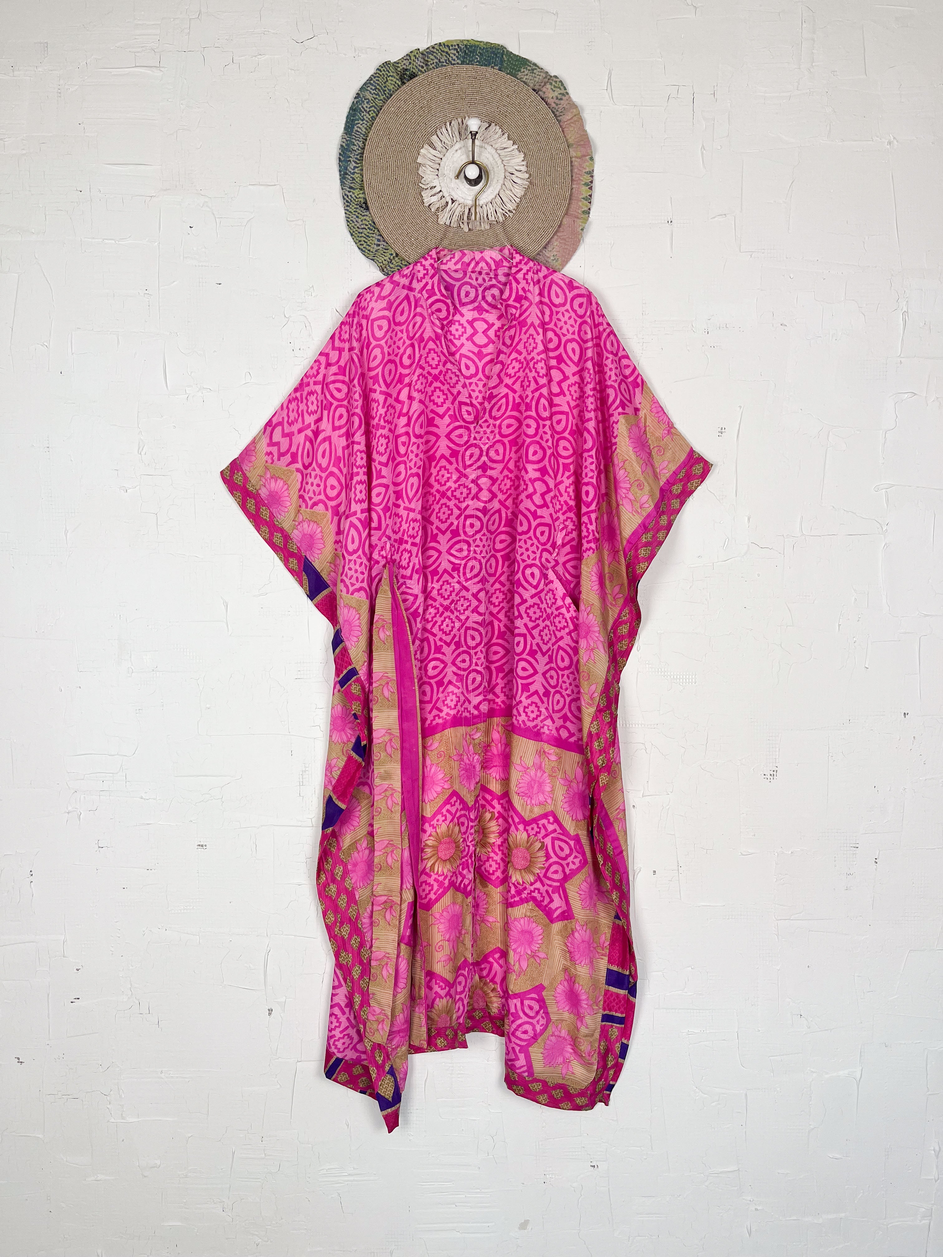 Imagine the lightweight silk, with its soft drape and subtle sheen, gently caressing your skin. The prints and patterns, inspired by vintage Indian sarees, unfold in beautiful shades, a vibrant tapestry of history and artistry. The kaftan's relaxed and airy silhouette gracefully falls to a maxi length, offering both comfort and sophistication. Short, wide sleeves enhance its breezy design, allowing you to move with effortless grace. A tie at the waist cinches, creating a flattering definition for all body shapes and sizes, while the side slits add an amazing flow, making the kaftan dance with your every step. This isn't just clothing; it's an expression of effortless elegance and bohemian-inspired style, designed to enhance your playful feminine spirit and rejuvenate your look.